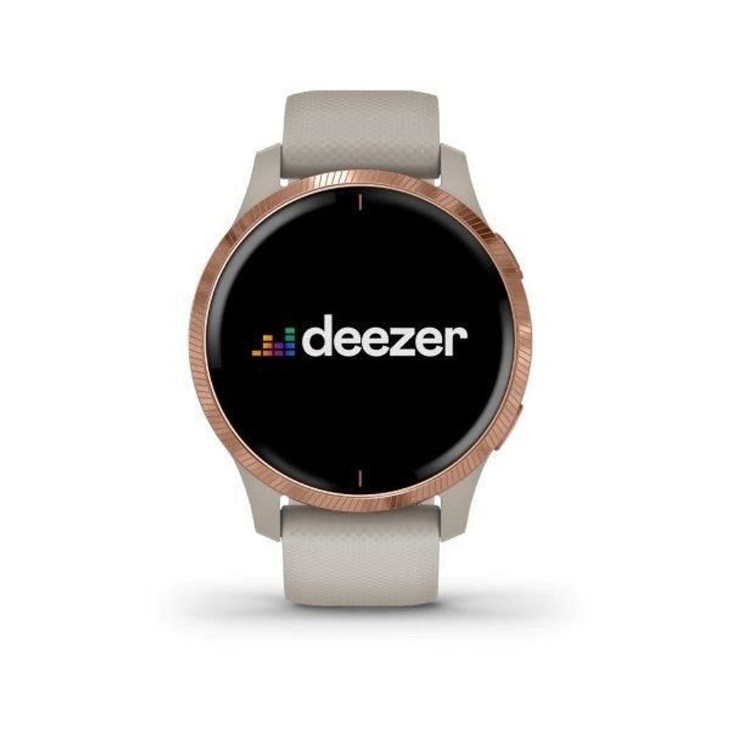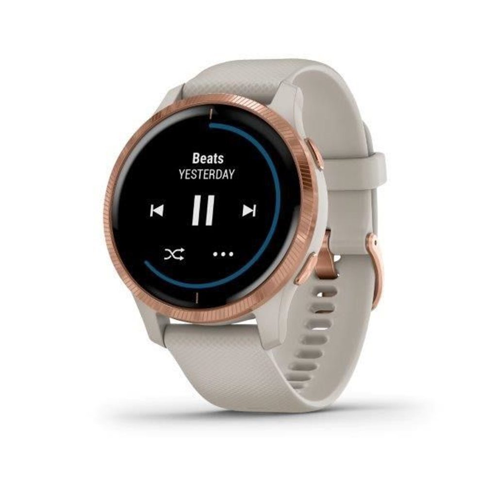 Púzdro chytrých GPS hodiniek Garmin Venu RoseGold/Sand Band 010-02173-23 je vyrobené z tvrdeného polyméru, luneta je oceľová s PVD úpravou. Vnútri tohto puzdra funguje modul s množstvom funkcií, užitočných najmä pri športe. Hodinky sú vybavené pripojením WiFi a ponúkajú prehrávanie hudby z vlastnej pamäte, do ktorej môžete nahrať vlastné hudobné súbory, ako aj zoznamy skladieb zo streamovacích hudobných služieb, ako je Spotify alebo Deezer.