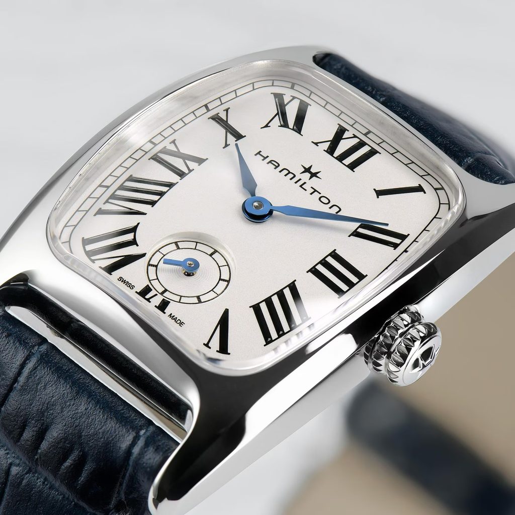 Hodinky Hamilton Boulton M s umne zakriveným tvarom puzdra a výrazným dizajnom v štýle art deco. Krásny biely ciferník hodiniek je vybavený rímskymi číslicami a na dotvorenie vzhľadu ho dopĺňa vhodný kožený remienok. Tieto hodinky, v ktorých sa bez problémov spája staré a nové, vyžarujú ženský štýl, ktorý je svieži a nadčasový.