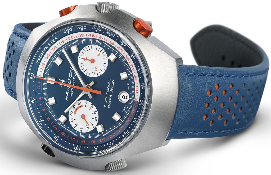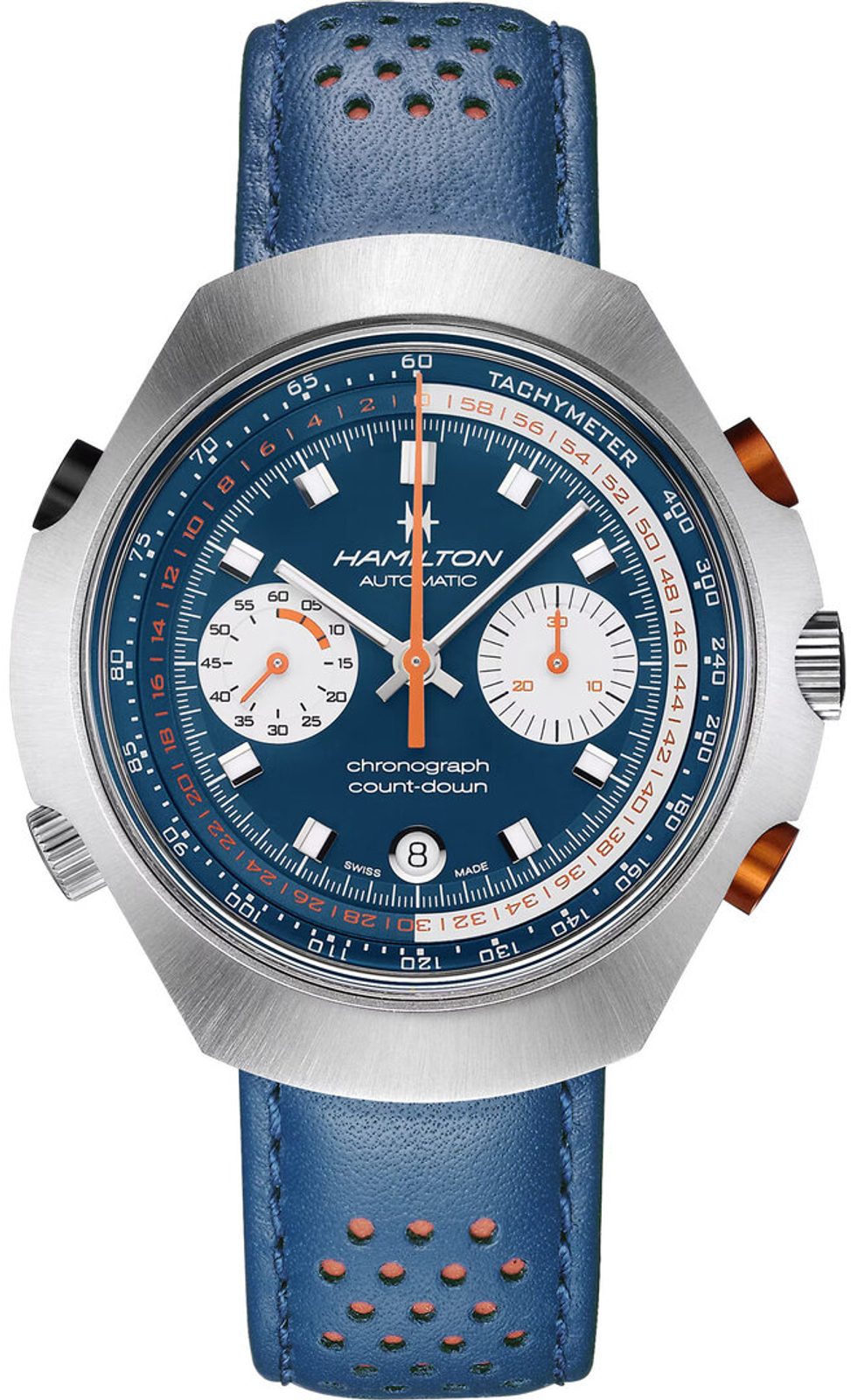 Jeho pretekárskeho ducha podčiarkuje tachymeter a perforovaný dvojfarebný kožený remienok. Hodinky Chrono-Matic 50 poháňa automatický strojček H-31 so 48 mm ciferníkom a autentickým puzdrom z nehrdzavejúcej ocele v štýle 70. rokov, ktorý vytvára pôsobivý dojem.