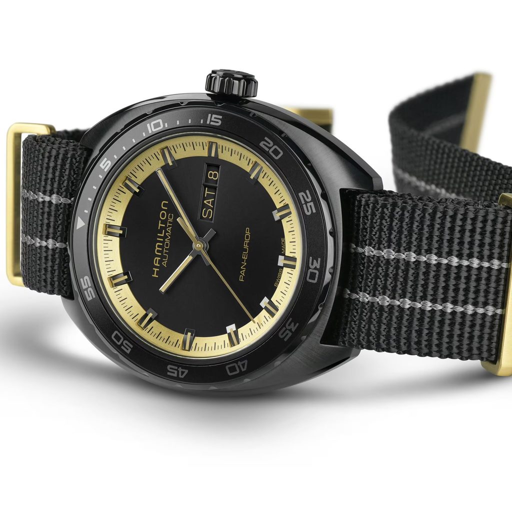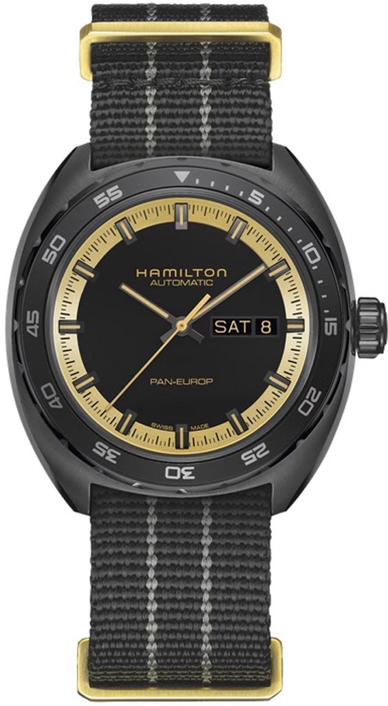 Pánsky model Hamilton American Classic Pan Europ Black & Gold Auto H35425730 si získa svojich majiteľov jednoduchým retro dizajnom, neopozeraným vzhľadom a precíznym spracovaním.