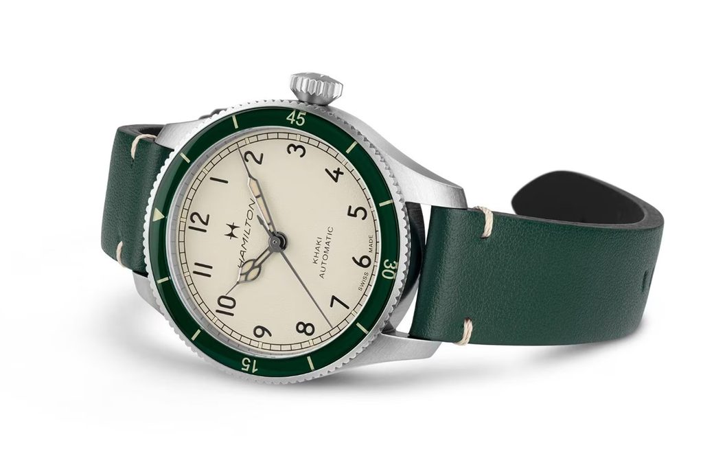 Hodinky Khaki Pilot Pioneer Auto 38 mm svojím osobitým retro šarmom pokračujú v uctievaní bohatej leteckej a vojenskej tradície spoločnosti Hamilton. Hodinky žiariace v machovo zelenej farbe s farebnou otočnou lunetou sú vybavené strojčekom H-10 a 80-hodinovou rezervou chodu. S mušľovým bielym ciferníkom a zeleným koženým remienkom sú to hodinky, ktoré nikdy nevyjdú z módy.