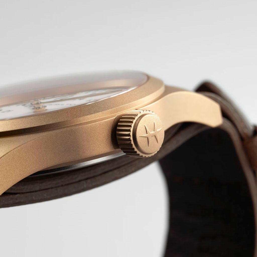 Pôvodné vojenské hodinky boli vylepšené vôbec prvým *bronzovýmpuzdrom v portfóliu Hamilton. Hodinky Hamilton Khaki Field Mechanical Bronze H69459510 majú jedinečný príbeh, ktorý sa bude odvíjať pri každom nosení, pretože ich puzdro časom získava výraznú patinu. Tento autentický 38 mm obľúbený strojček poháňaný exkluzívnym strojčekom s manuálnym náťahom H-50, ukrytý za titánovým ciferníkom a doplnený mäkkým hnedým koženým remienkom NATO, oslavuje vojenské dedičstvo značky Hamilton s výhľadom do budúcnosti.