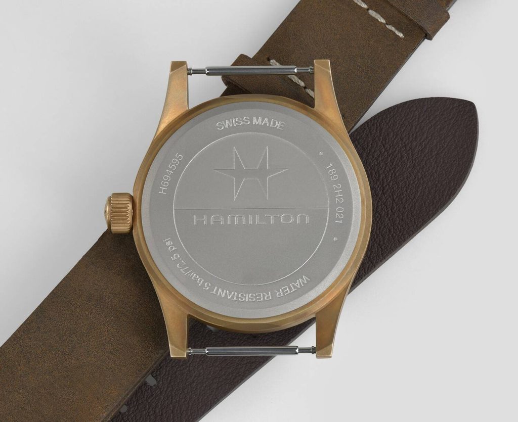 Pôvodné vojenské hodinky boli vylepšené vôbec prvým *bronzovýmpuzdrom v portfóliu Hamilton. Hodinky Hamilton Khaki Field Mechanical Bronze H69459530 majú jedinečný príbeh, ktorý sa bude odvíjať pri každom nosení, pretože ich puzdro časom získava výraznú patinu. Tento autentický 38 mm obľúbený strojček poháňaný exkluzívnym strojčekom s manuálnym náťahom H-50, ukrytý za titánovým ciferníkom a doplnený mäkkým hnedým koženým remienkom NATO, oslavuje vojenské dedičstvo značky Hamilton s výhľadom do budúcnosti.