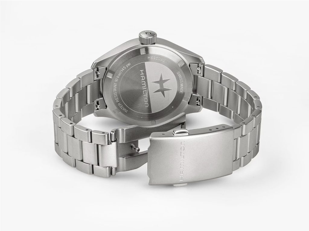 Puzdro hodiniek Hamilton H69509110 je vyrobené z nehrdzavejúcej ocele a hodinky držia na zápästí vďaka kvalitne spracovanému oceľovému náramku so skladacím zapínaním.