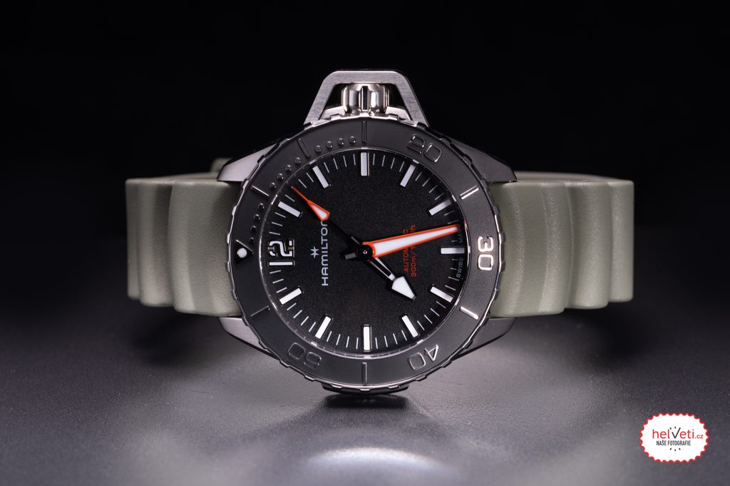 HodinkyKhaki Navy Frogman Automatic s novým nebojácnym vzhľadom sú technicky najzručnejšími hodinkami Hamilton pripravenými na námornú techniku. Tento precízny prístroj, navrhnutý pre presnosť, čitateľnosť a odolnosť, prináša na vaše zápästie nezmernú silu oceánu vďaka jedinečne tvarovanému krytu korunky a taktickému gumovému remienku so vzhľadom pripomínajúcim vlnu.