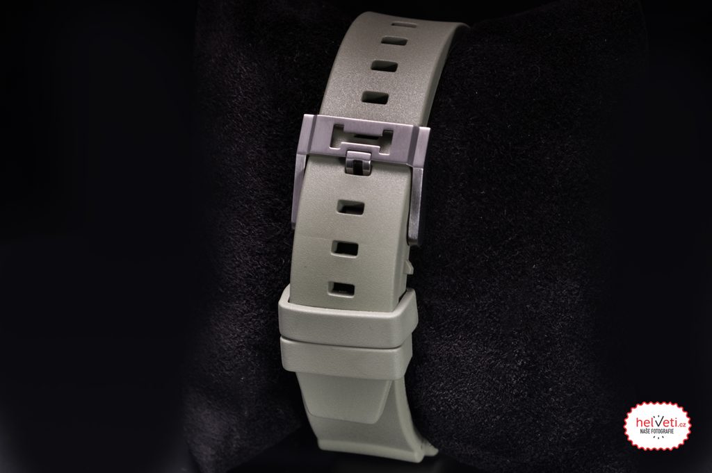 Na oceľové puzdro hodiniek nadväzuje kvalitne spracovaný zelený gumený remienok so striebornou tŕňovou sponou.