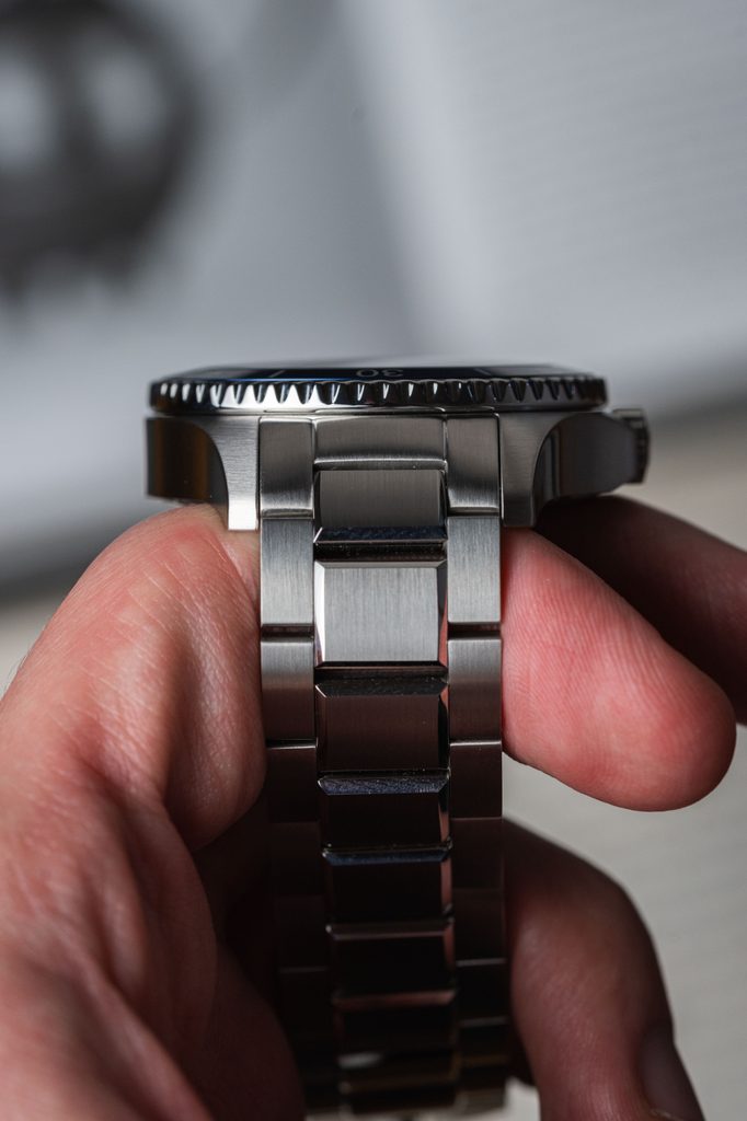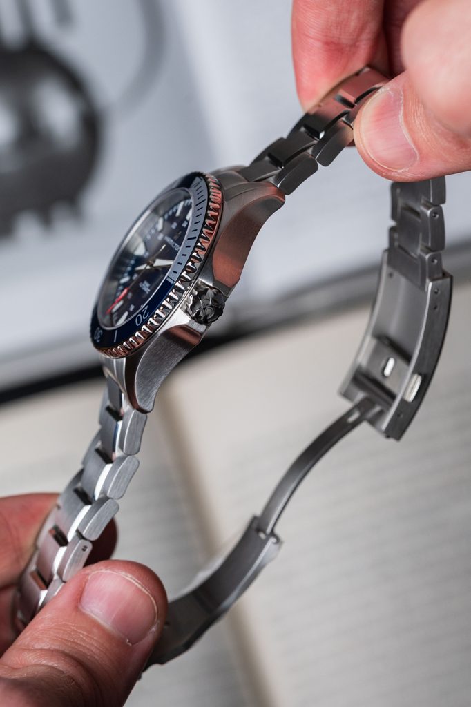 Na oceľové puzdro hodiniek nadväzuje kvalitne spracovaný oceľový náramok so sklopnou sponou (spona má mikroreguláciu).
