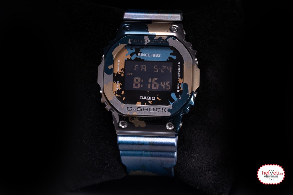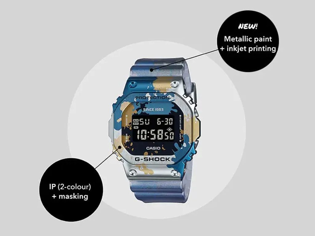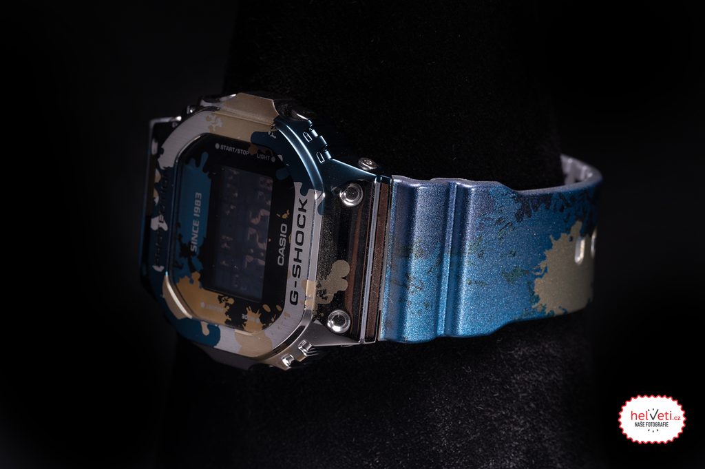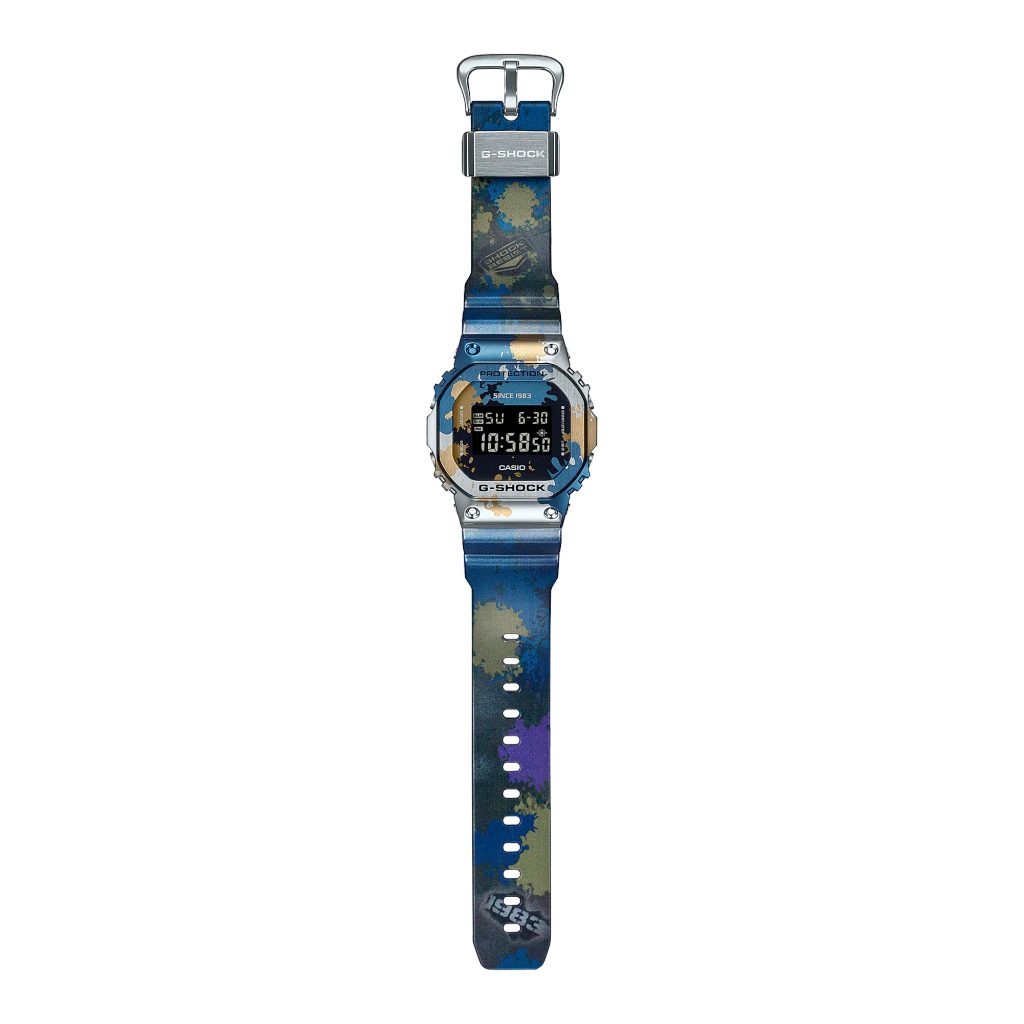 Hodinky Casio G-Shock GM 5600SS-1 sú novým prírastkom do série Street Spirit, ktorá sa vyznačuje graffiti vzorom. Inšpiráciou pre túto sériu bol voľnočasový mestský štýl.Inovatívny dizajn má zaujímavý vzor prekrývajúcich sa modrých a zlatých škvŕn, ktoré zvýrazňujú striebornú základnú farbu kovového puzdra.Rovnakývzor je aj na ciferníku a gumovom remienku, kde je použitá metalická farba a atramentová tlač. Celý dizajn hodiniek evokuje vzhľad pouličného "shutter art", pretože zachytáva vzhľad a pocit farby nastriekanej sprejom.