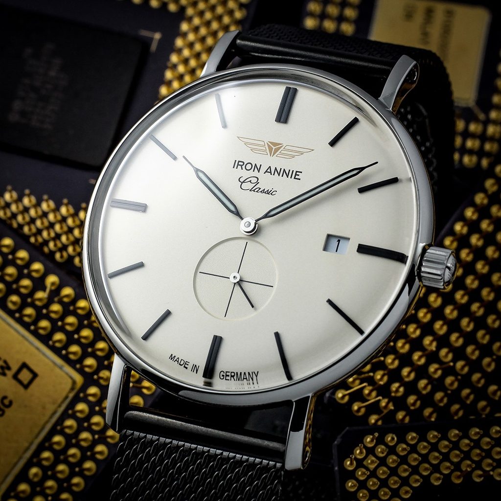 Hodinky Iron Annie 5938M-1 poháňa švajčiarsky batériový strojček Ronda 6004.D, ktorý je zaujímavý mimostredným uložením sekundovej ručičky v číselníku na pozícii 6. hodiny. Nadčasový a prehľadnosťou vynikajúci číselník je osadený plastickými indexmi na hodinových pozíciách a výraznými ručičkami s nánosom luminiscencie. Oceľové puzdro hodiniek dopĺňa kovový pletený náramok, tzv. mesh. Číselník je chránený minerálnym sklíčkom. Vďaka priemeru puzdra 41 mm sú ideálne pre väčšinu pánskych zápästí. Vzhľadom na určenie modelu, je vodotesnosť dostatočných 50 metrov - hodinky zvládnu kontakt s vodou pri umývaní rúk, daždi či ojedinelej sprche.