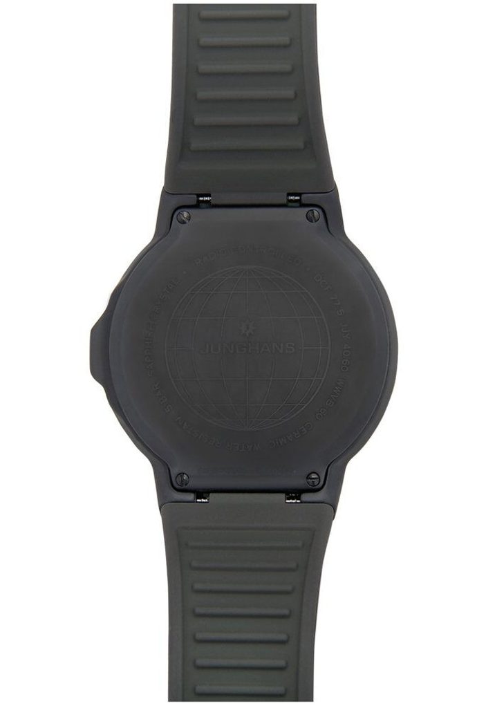 Model Junghans 018/1000.00 je ďalej vďaka možnosti príjmu rádiového signálu vybavený o funkciu automatického kalendára, funkciu prechodu medzi letným a zimným časom, či automatickej synchronizácii času pri prechode medzi časovými pásmami. Ciferník je chránený zafírovým sklíčkom, ktoré je vysoko odolné proti poškriabaniu. Puzdro s priemerom 40,4 mm je vyrobené z keramiky, remienok tohto modelu je gumový. S vodeodolnosťou 50 metrov (5 ATM) znesú hodinky kontakt s vodou, ktorý môžeme prirovnať k sprchovaniu či umývaniu rúk.