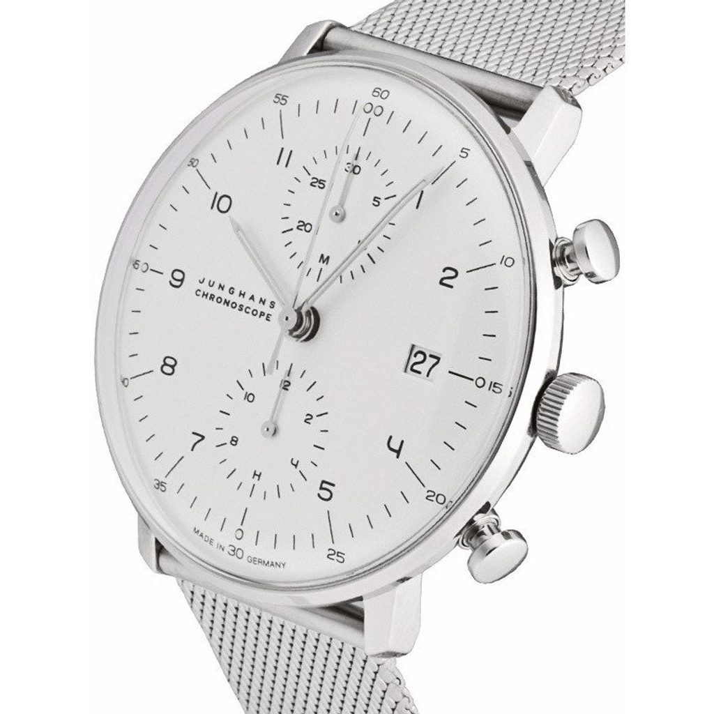 Nemecké hodinky Junghans Max Bill Chronoscope Sapphire 27/4003.46 zo série Max Bill sú obľúbené pre svoj čistý, nadčasový vzhľad inšpirovaný umeleckým štýlom Bauhaus v kombinácii s kvalitným spracovaním.