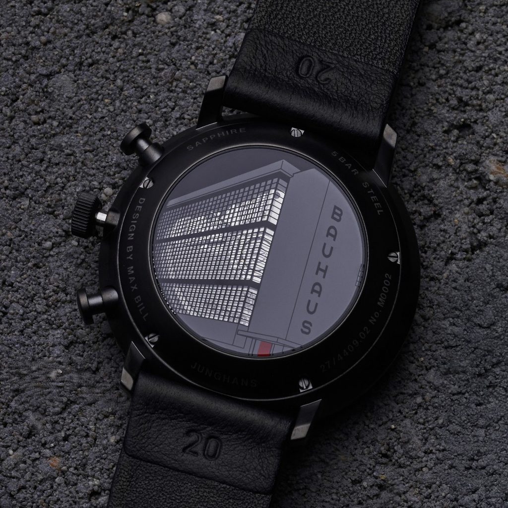Ciferník je inšpirovaný jednoduchosťou umeleckého štýlu Bauhaus. Dizajn hodiniek navrhol pre spoločnosť Junghans švajčiarsky architekt, sochár a dizajnér Max Bill v 60. rokoch 20. storočia a odvtedy sa prakticky nezmenil. Chráni ho zafírové sklíčko, ktoré je maximálne odolné proti poškriabaniu. Obojstranná antireflexná vrstva zabezpečuje vynikajúcu čitateľnosť aj na priamom slnečnom svetle. Ukazovateľ dátumu sa nachádza na pozícii 3 hodín. Ďalšou funkciou, ktorú tento model ponúka, je funkcia stopiek. Puzdro s priemerom 40 mm ocenia aj milovníci menších pánskych hodiniek. Vodotesnosť tohto modelu je 50 m, takže zvládne aj kontakt s vodou, napríklad pri daždi alebo sprchovaní.