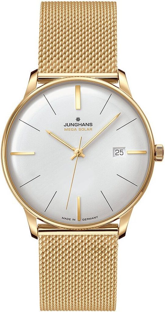 Puzdro tohto modelu je vyrobené z nehrdzavejúcej ocele s povrchovou úpravou z ružového zlata PVD a jeho eleganciu umocňuje oceľový milánsky strojček, tiež s povrchovou úpravou z ružového zlata PVD. Vďaka jednoduchosti umeleckého štýlu Bauhaus pôsobí ciferník veľmi elegantným dojmom.Chráni ho zafírové sklíčko, ktoré zaručuje maximálnu ochranu pred poškriabaním, zatiaľ čo obojstranná antireflexná vrstva poskytuje vynikajúcu čitateľnosť aj pri ostrom svetle. Na ciferníku nájdeme mapu sveta s umiestnením rádiových vysielačov, podľa ktorých sa hodinky nastavujú. Hodinky možno nastaviť aj pomocou aplikácie Junghans MEGA App v smartfóne, ktorá je k dispozícii pre systémy Android a iOS. Vodotesnosť je 50 metrov (5 ATM) - hodinky teda vydržia bežný kontakt s vodou, napríklad dážď alebo sprchovanie.