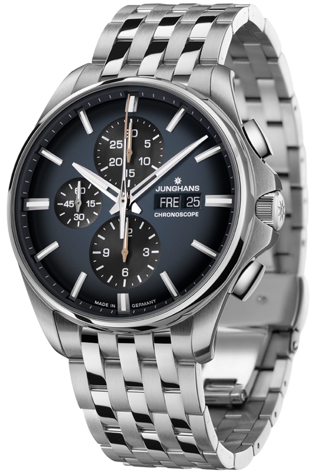 Nemecké hodinky Junghans Meister S Chronoscope 27/4228.44 zo série Meister prinášajú revolučnú interpretáciu série Mesiter. Tá spočíva predovšetkým v jeho športovom vzhľade a funkciách.