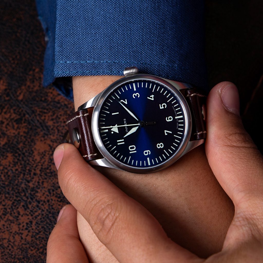 Junkers Baumuster A 920.01.01 z modelového radu Baumuster odkazuje na slávnu B-Uhr alebo Beobachtungsuhr. Tie sa preslávili ako hodinky pre pilotov a navigátorov, najmä počas druhej svetovej vojny. Najdôležitejšie však je, že ide o typické letecké hodinky s dokonalou čitateľnosťou a nadčasovým dizajnom, vhodné na každodenné nosenie.