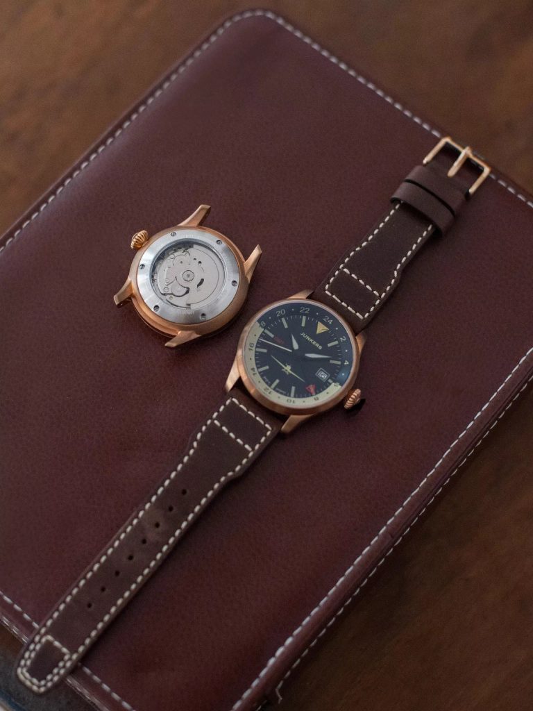 Na rozdiel od mnohých hodiniek, ktoré majú iba bronzový náter, je puzdro hodiniek Junkers Flieger Bronze GMT 966.01.02 vyrobené z masívneho bronzu. Tento špeciálny materiál si časom vytvorí jedinečnú patinu, vďaka čomu sú každé hodinky úplne unikátne.