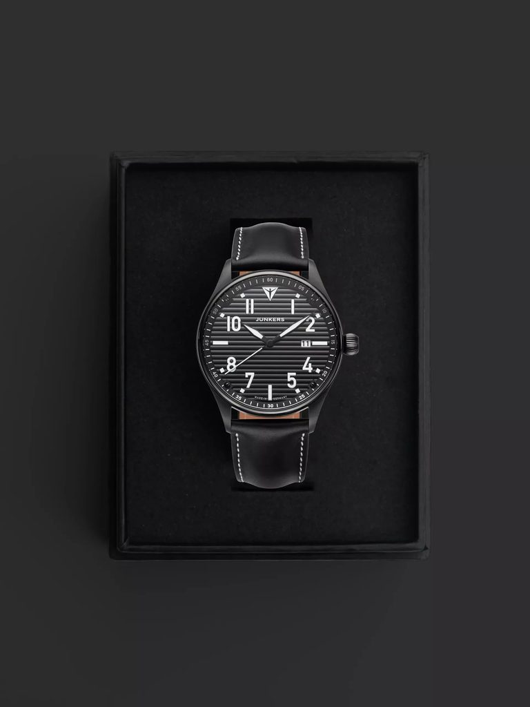 Hodinky Junkers 903.03.02 majú puzdro z nehrdzavejúcej ocele s čiernou PVD úpravou, v ktorom sa nachádza japonský batériový strojček Miyota 2035. Na pozícii 3 hodín má ukazovateľ dátumu. Ciferník má pilotný štýl, ktorý hodinkám dodáva skvelú čitateľnosť. Hodinky sa dodávajú so štýlovým koženým remienkom.