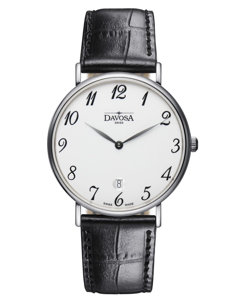 Hodinky Davosa Pianos II 162.485.26 sú elegantné spoločenské hodinky. Skvele spracovaný ciferník s výraznými číslicami a ukazovateľom dátumu je chránený zafírovým sklíčkom a puzdro je vyrobené z ušľachtilej ocele. To všetko dopĺňa kvalitný čierny kožený remienok s krokodílím vzorom. Hodinky poháňa strojček Ronda 714 a sú vodotesné do 3 ATM.