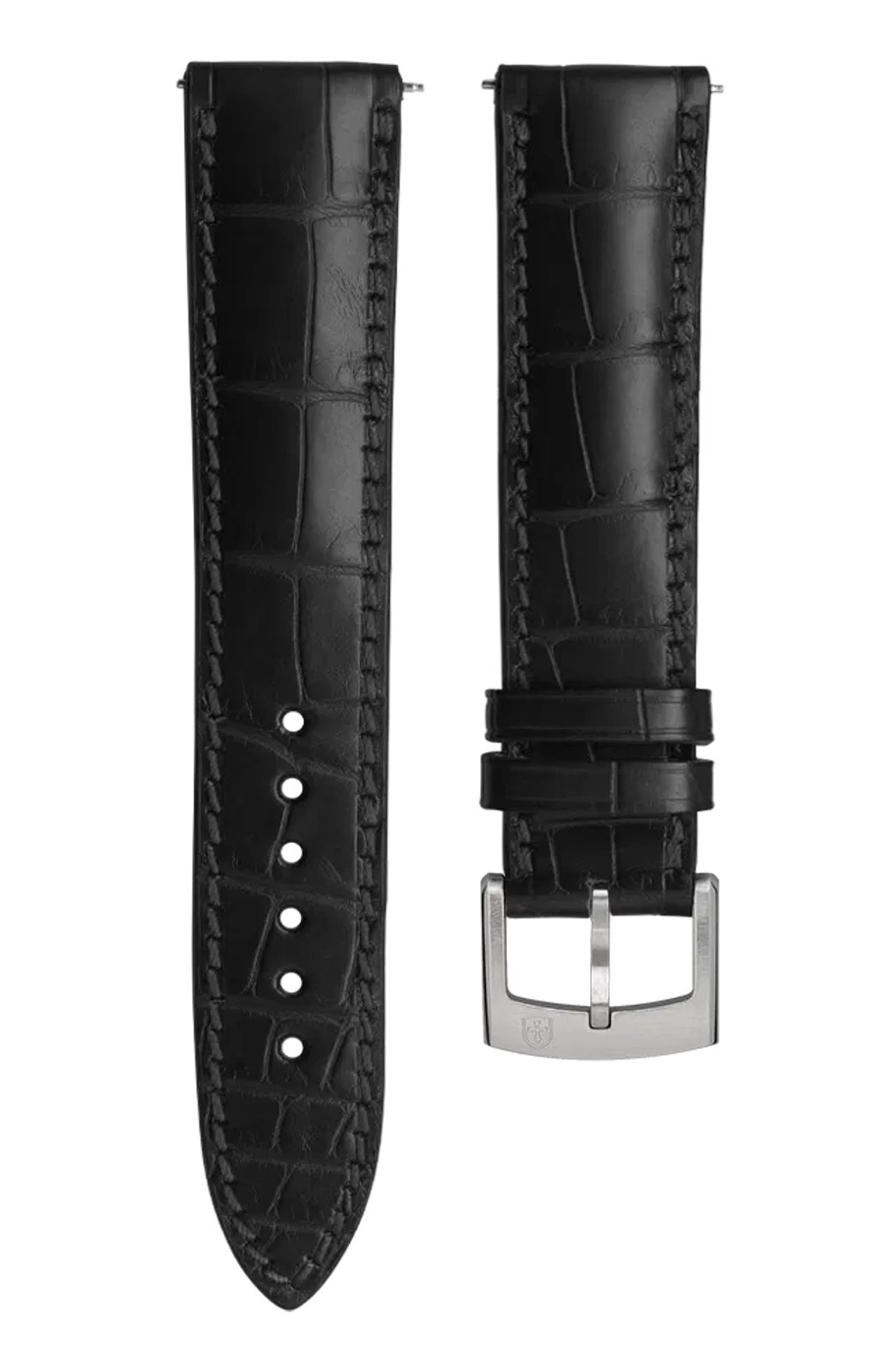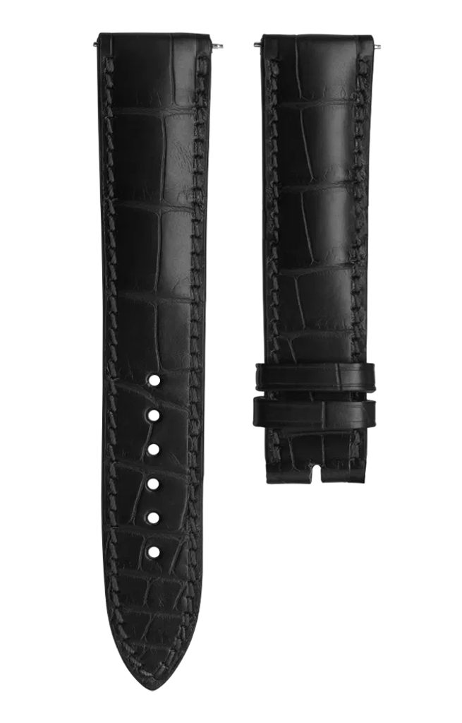 Čierny kožený remienok Biatec z pravej aligátorej kože so špecifickou textúrou a hnedým prešívaním môže vďaka svojim vlastnostiam ponúknuť vysoký komfort pri nosení.
