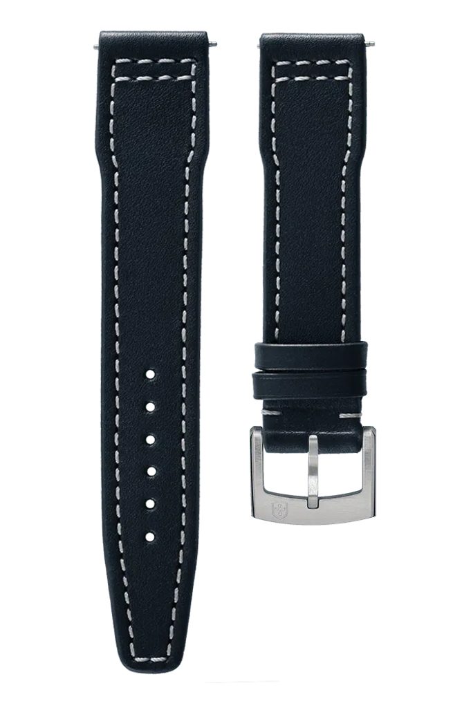 Kožený remienok Biatec Marinemodrej farby v námorníckom štýle s jemnou štruktúrou a bielym prešívaním má vysokú odolnosť proti vode a poškriabaniu. Môže sa tiež pochváliť dobrou pružnosťou, ktorá zaručuje vysoký komfort pri nosení.