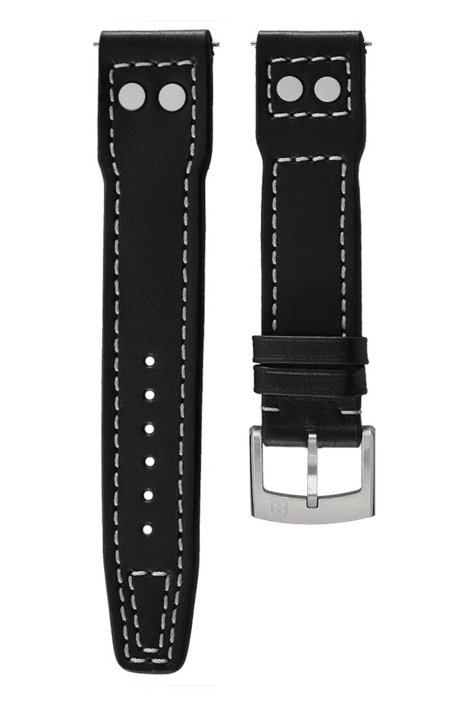 Čierny kožený remienok Biatec v pilotnom štýle s jemnou štruktúrou a bielym prešívaním má vysokú odolnosť proti vode a poškriabaniu. Môže sa tiež pochváliť dobrou pružnosťou, ktorá zaručuje vysoký komfort pri nosení.
