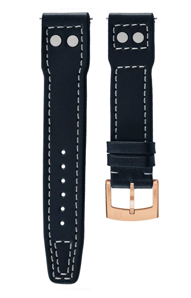 Modrý kožený remienok Biatec v pilotnom štýle s jemnou štruktúrou a bielym prešívaním má vysokú odolnosť proti vode a poškriabaniu. Môže sa tiež pochváliť dobrou pružnosťou, ktorá zaručuje vysoký komfort pri nosení.