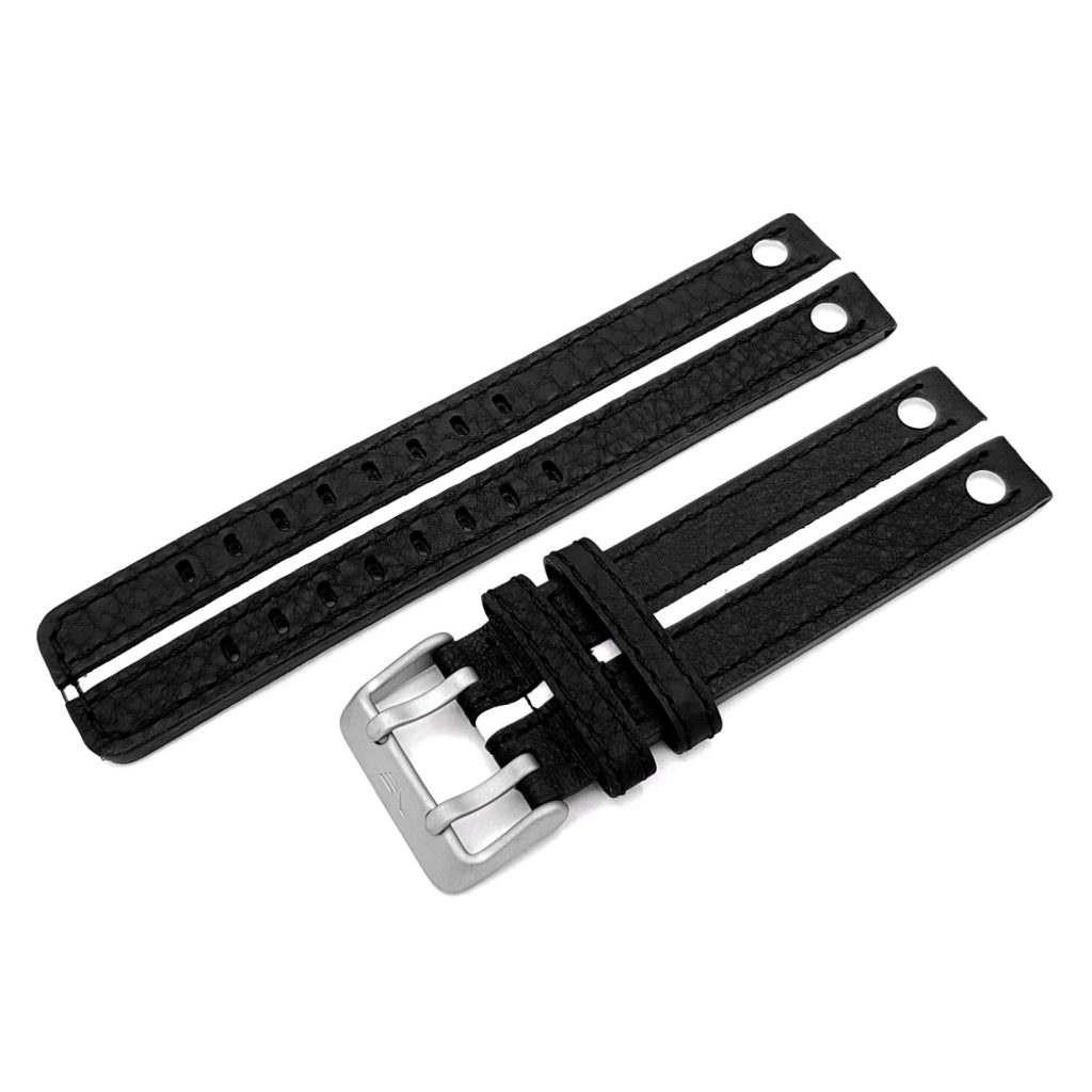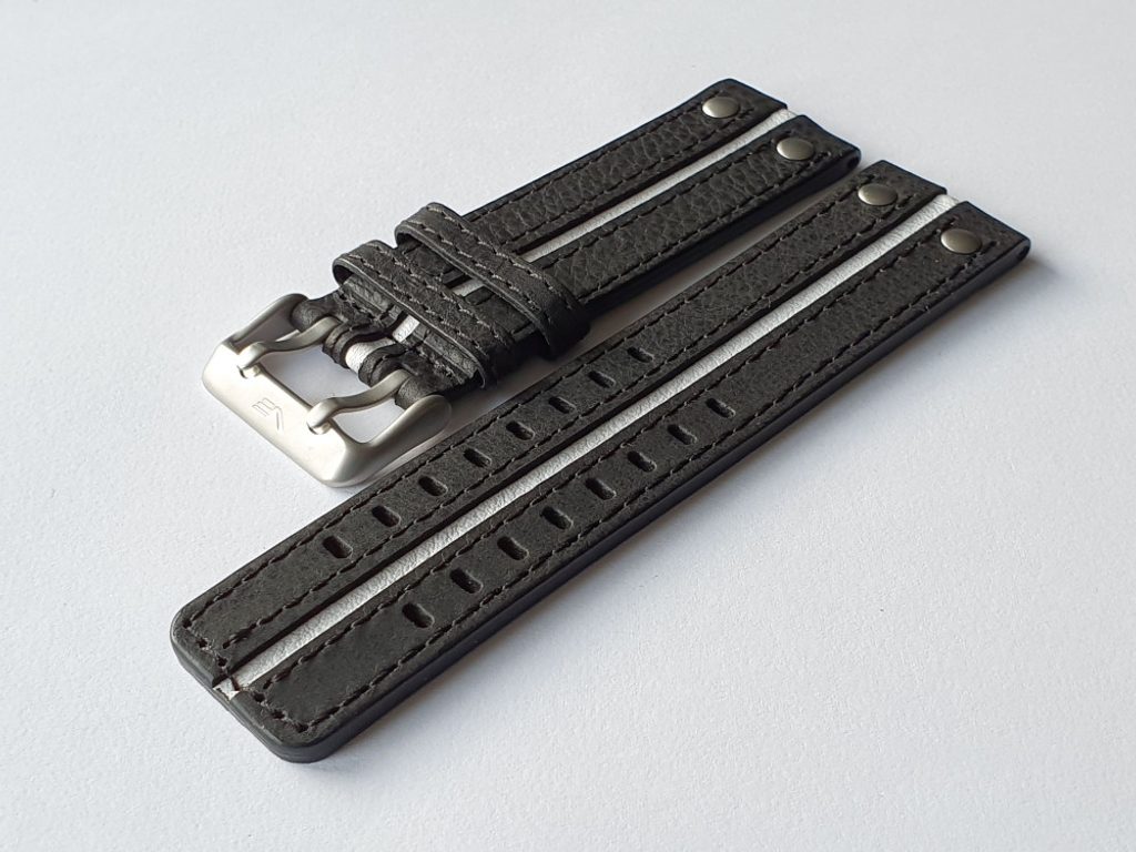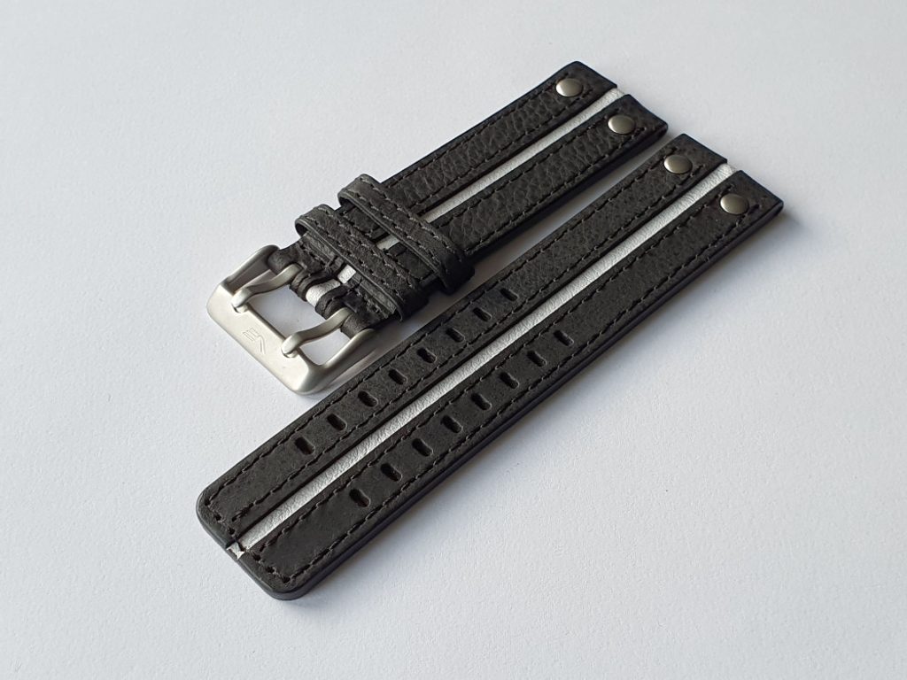 Originálny kožený remienok Vostok Europe pre modelovú radu Expedition North Pole-1. Remienok je vyrobený z 24 mm širokej kože s bielym stredovým pruhom, prešitý čiernou niťou.