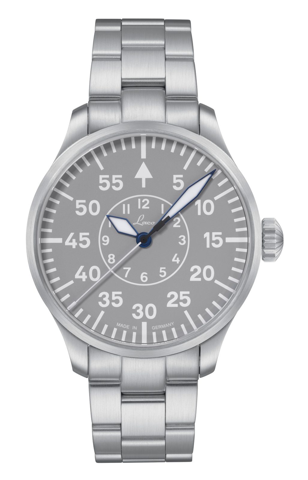 Medzi klasické charakteristické znaky hodiniek Laco Aachen Grau 42 MB, inšpirované leteckým štýlom, patria výrazné a ľahko čitateľné ručičky a indexy na pozíciách hodín a ľahko ovládateľná korunka. Dokonale prehľadný ciferník s označením B chráni zafírové sklíčko odolné proti poškriabaniu. Ciferník typu B-Uhr má po obvode ciferníka vytlačenú minútovú stupnicu so šípkou na pozícii 12 hodín na rýchlu orientáciu pre letcov a hodinovú stupnicu vytlačenú na vnútornom kruhu. Luminiscencia, ktorá sa nachádza na ručičkách, čísliciach a indexoch, zabezpečuje lepšiu čitateľnosť za zhoršených svetelných podmienok. Ručičky hodiniek sú len druhýkrát (po modeloch Laco Polar) v tejto sérii tepelne modré.