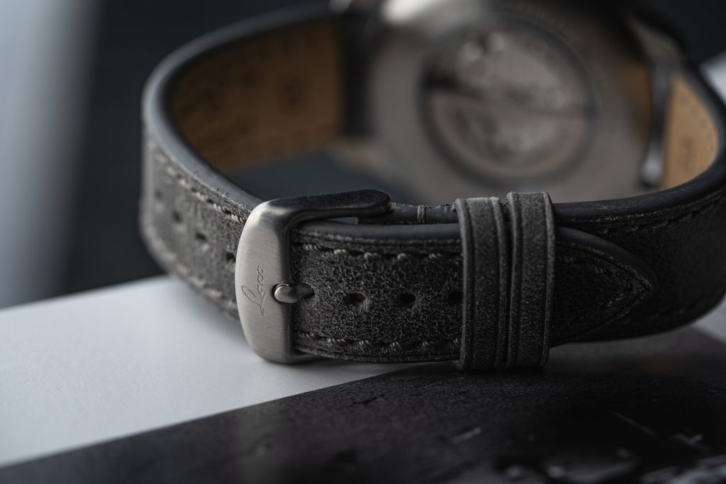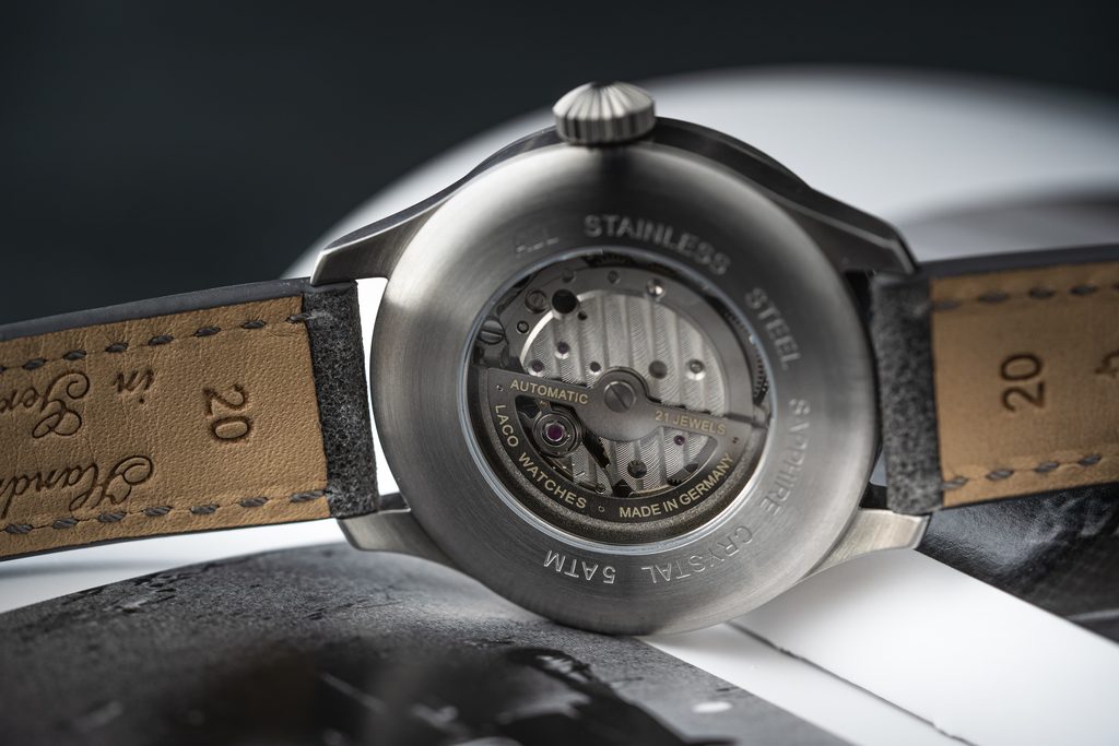 Oceľové puzdro hodiniek Laco Flieger Augsburg Grau 39 dopĺňa sivý kožený remienok s výraznými nitmi. Poháňa ich mechanický strojček so samonáťahom Laco 2S (základ Miyota 82S0), ktorý ponúka rezervu chodu približne 42 hodín, funkciu stop-sekúnd pri nastavovaní času (hacking) a možnosť manuálneho naťahovania. Mnohých poteší možnosť pozorovať strojček cez priehľadné vieko opatrené zafírovým sklíčkom. Vodotesnosť týchto hodiniek je 50 m (5 ATM). Priemer puzdra je 39 mm, dĺžka (lug-to-lug) je 46,5 mm, takže hodinky dobre padnú na väčšinu pánskych zápästí.