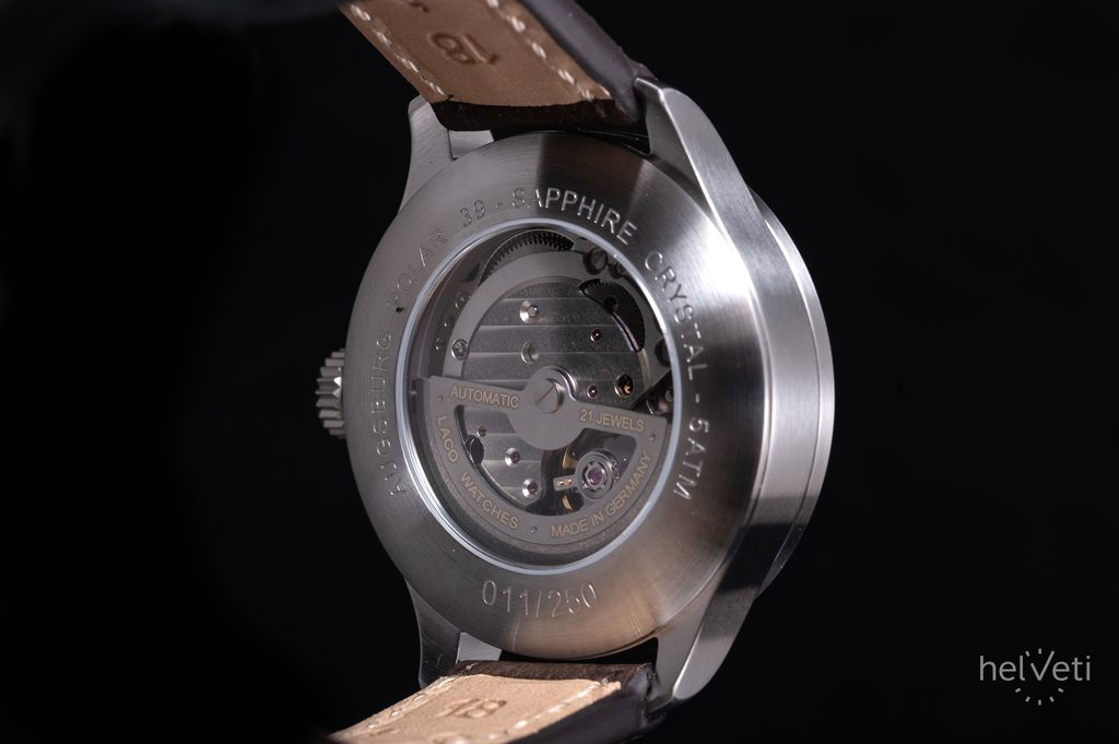 Oceľové puzdro hodiniek Laco Flieger Augsburg Polar 39 dopĺňa tmavohnedý kožený remienok s kontrastným svetlým prešívaním a výraznými nitmi. Poháňa ich mechanický strojček so samonáťahom Laco 2S (základ Miyota 82S0), ktorý ponúka rezervu chodu približne 42 hodín, funkciu stop-sekúnd pri nastavovaní času (hacking) a možnosť manuálneho naťahovania. Mnohých poteší možnosť pozorovať strojček cez priehľadné vieko opatrené zafírovým sklíčkom. Vodotesnosť týchto hodiniek je 50 m (5 ATM). Priemer puzdra je 39 mm, dĺžka (od ucha k uchu) je 46,5 mm, takže hodinky dobre padnú na väčšinu pánskych, ale aj mnohých dámskych zápästí.