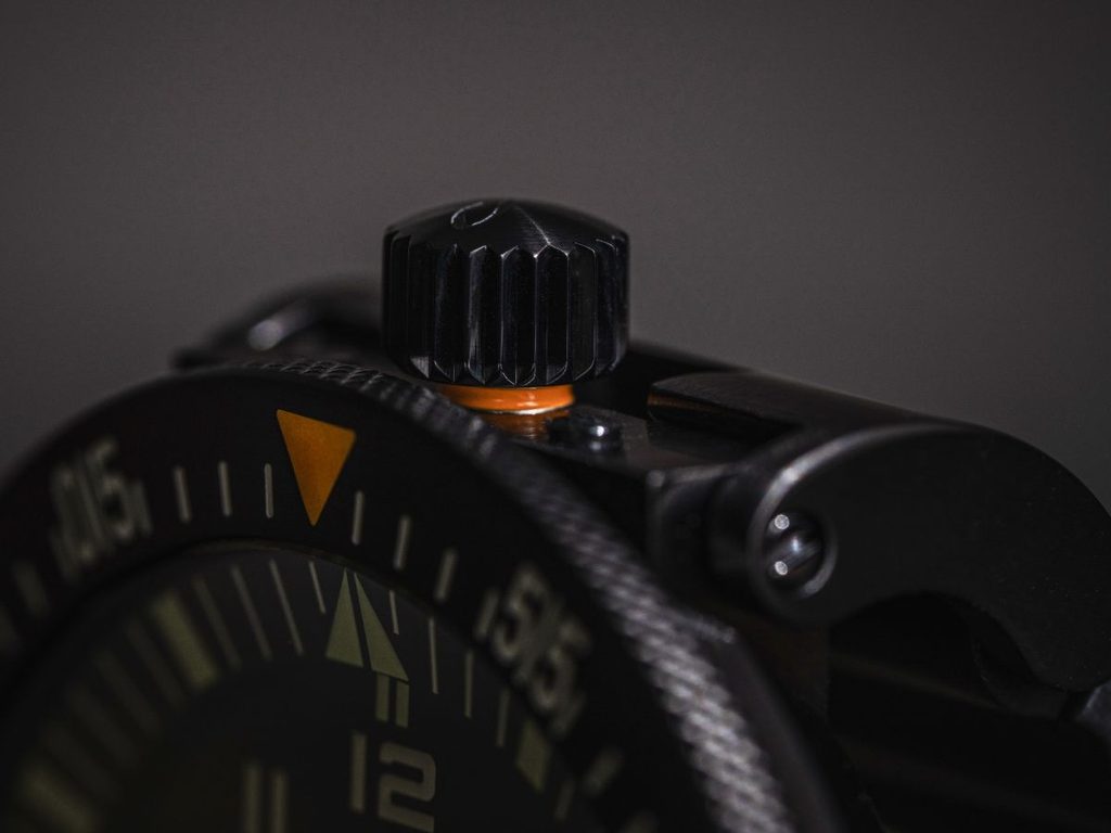 Charakteristický prvok korunky na 12. hodine zostal zachovaný, ale dočkal sa praktickej inovácie: oranžový indikátor teraz ukazuje, či je korunka bezpečne naskrutkovaná.