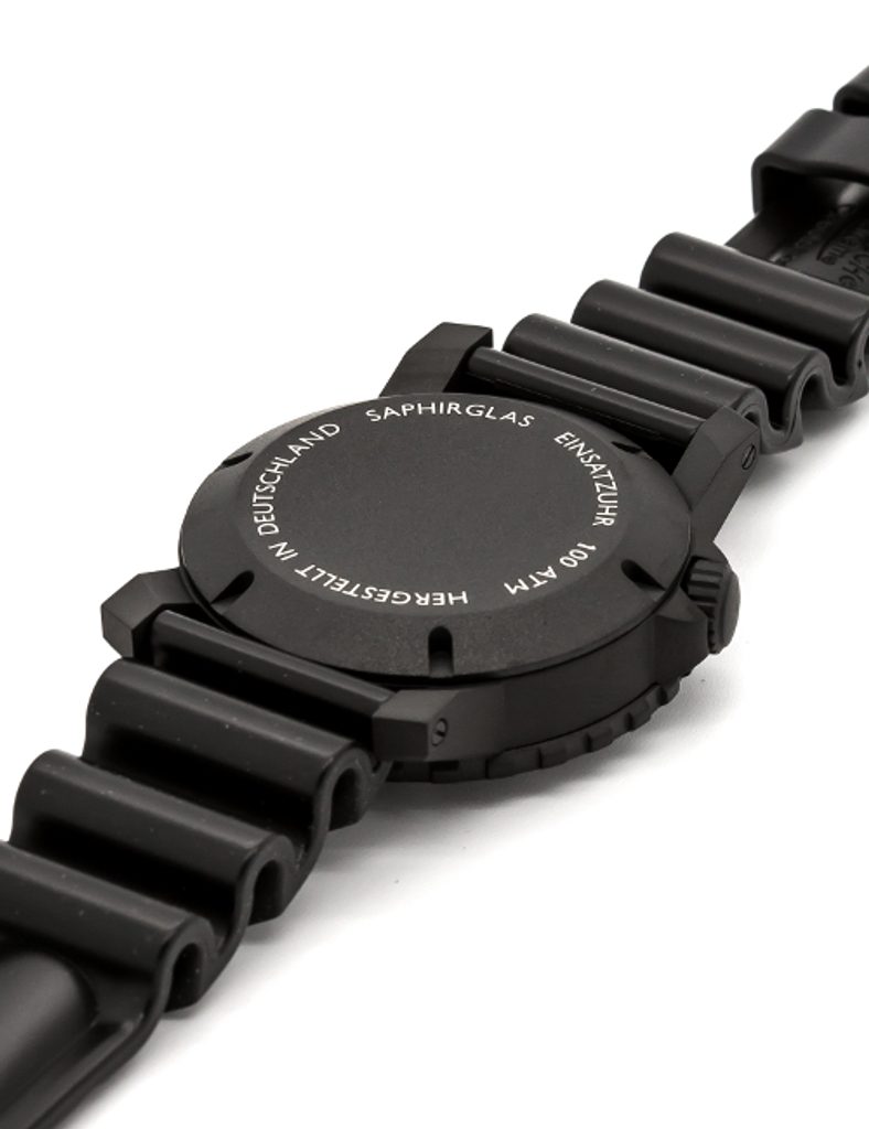 HodinkyLaco Einsatzuhr Seven Seas zo série Squad majú robustné puzdro so skrutkovacou korunkou umiestnenou netradične na pozícii 9 až 10 hodín. Táto poloha nebráni jednoduchému používaniu a zaručuje, že hodinky sú na zápästí pohodlné aj napriek väčšej veľkosti puzdra. Oceľové puzdro s čiernou PVD úpravou dopĺňa čierny remienok z prírodnej gumy. Hodinky majú jednosmerne rotujúcu potápačskú lunetu s minútovými značkami. Čierny ciferník sa vyznačuje vynikajúcou prehľadnosťou a čitateľnosťou, ktorú za zhoršených svetelných podmienok zvyšuje luminiscencia ručičiek a indexov. Chráni ho vypuklé zafírové sklíčko s vnútornou antireflexnou vrstvou. S priemerom puzdra 45,8 mm a dĺžkou (od ucha k uchu) 55,3 mm hodinky dobre sedia na zápästí vďaka dômyselnému tvaru puzdra. Vodotesnosť modelu je 1000 m ( 100 ATM) a podporuje ju skrutkovacia korunka a vieko. Héliový ventil sa nachádza na pravej strane hodiniek. Hodinky sú skutočným profesionálnym nástrojom, ktorý je svojou výbavou predurčený na používanie v nepriaznivých podmienkach, pri športe a vo vode.