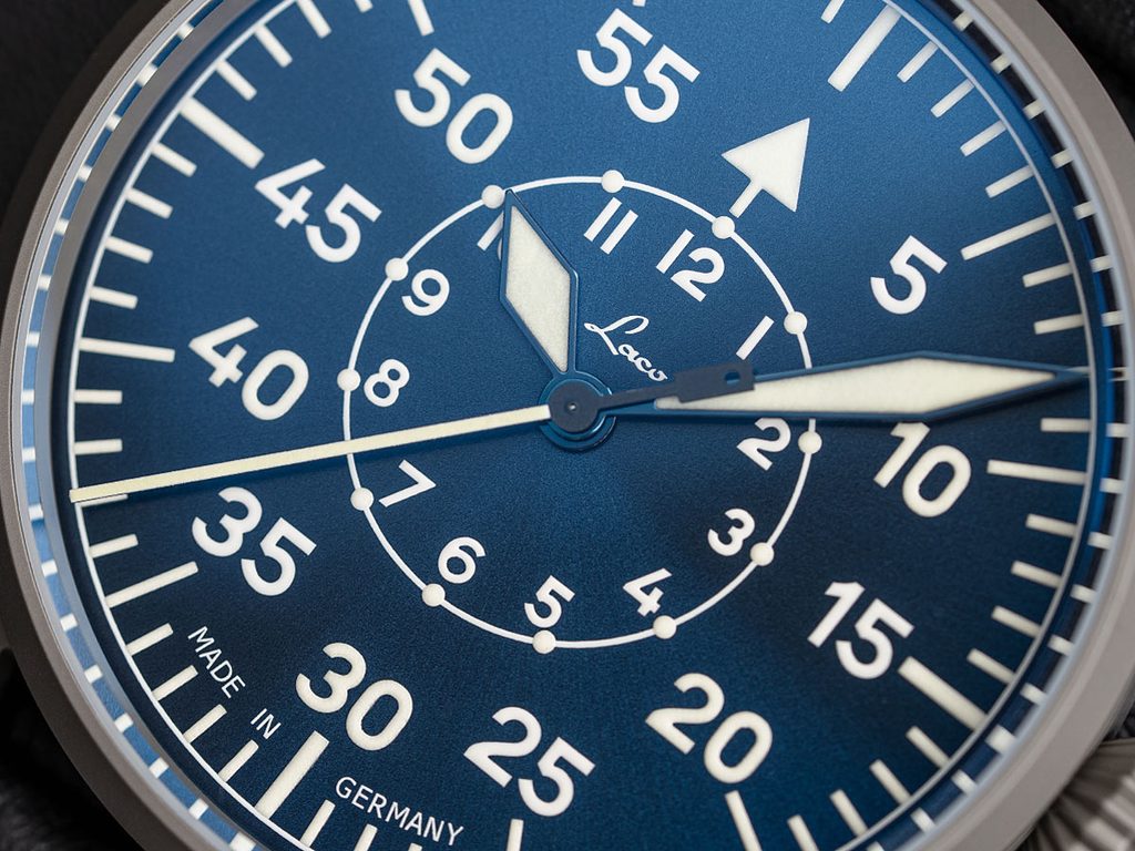 Medzi klasické charakteristické znaky pilotných hodiniek Laco Karlsruhe Pro Blau 37 Handwinding patria výrazné a ľahko čitateľné ručičky a indexy na hodinových pozíciách a veľká korunka, ktorá sa ľahko ovláda aj v rukaviciach. Dokonale priehľadný ciferník typu B chráni kupolovité zafírové sklíčko s vnútornou antireflexnou vrstvou a vysokou odolnosťou proti poškriabaniu. Ciferník B-Uhr typu B má po obvode vytlačenú minútovú stupnicu so šípkou na 12. hodine na rýchlu orientáciu pre letcov a hodinovú stupnicu vytlačenú na vnútornom kruhu. Luminiscencia na ručičkách, čísliciach a indexoch zabezpečuje lepšiu čitateľnosť pri slabom osvetlení. Ručičky hodiniek sú termálne modré.