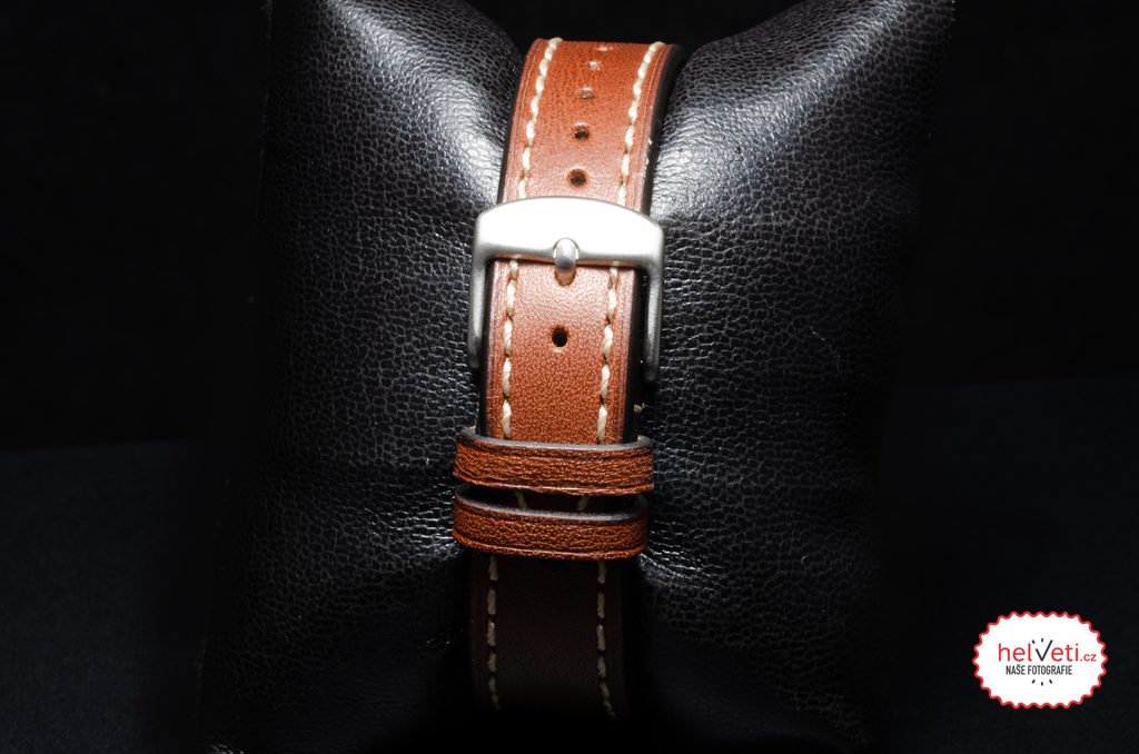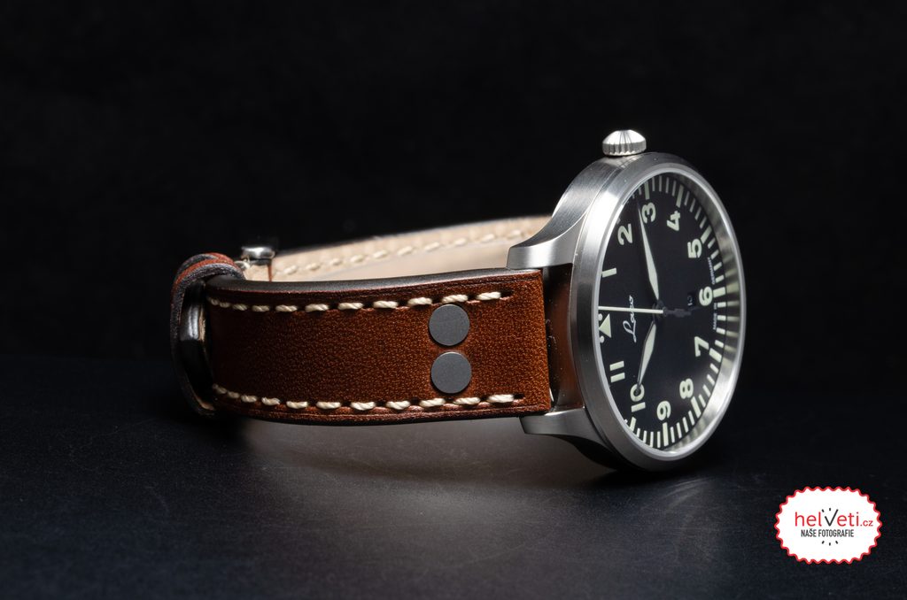 Oceľové puzdro hodiniek Laco Flieger Genf.2.D 40 dopĺňa hnedý kožený remienok s kontrastným bielym prešívaním a výraznými nitmi. Ide o alternatívu k mechanickým modelom, v tomto prípade poháňanú batériovým strojčekom Ronda 503 s funkciou dátumu na pozícii 6 hodín, ktorá zaisťuje vysokú presnosť prevádzky za každých okolností. Vodotesnosť týchto hodiniek je 50 m (5 ATM), takže zvládnu aj plávanie. S priemerom puzdra 40 mm, dĺžkou lug-to-lug) 47,5 mm a výškou len 9 mm hodinky dobre sedia na väčšine mužských zápästí.