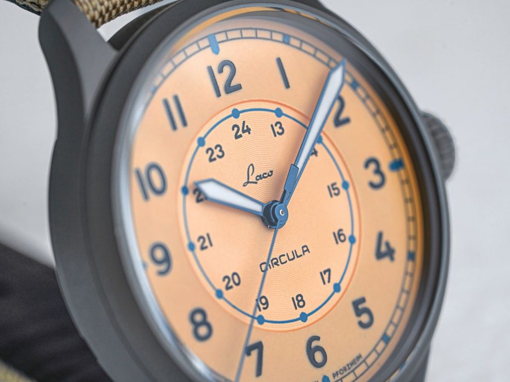 Druhé hodinky naopak využívajú puzdro modelu Circula ProTrail a kombinujú ho s čiernym ciferníkom inšpirovaným hodinkami pre pilotov B, čím vzdávajú hold dizajnovému jazyku a pilotnému charakteru modelu Laco Flieger PRO.