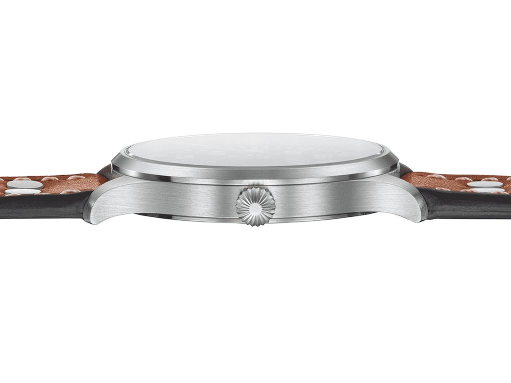 Oceľové puzdro hodiniek Laco Flieger Zürich.2.D 40 dopĺňa hnedý kožený remienok s kontrastným bielym prešívaním a výraznými nitmi. Ide o alternatívu k mechanickým modelom, v tomto prípade poháňanú batériovým strojčekom Ronda 503 s funkciou dátumu na pozícii 6 hodín, ktorá zaisťuje vysokú presnosť prevádzky za každých okolností. Vodotesnosť týchto hodiniek je 50 m (5 ATM), takže zvládnu aj plávanie. S priemerom puzdra 40 mm, dĺžkou (od ucha k uchu) 47,5 mm a výškou len 9 mm hodinky dobre sedia na väčšine mužských zápästí.