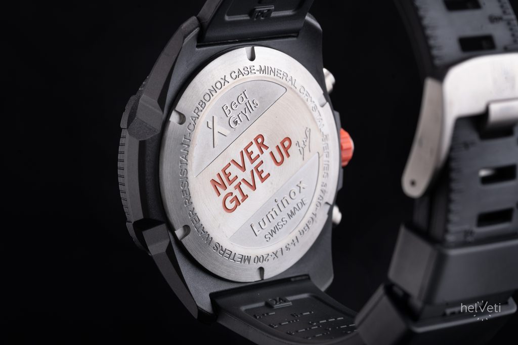 Hodinky kryje tvrdené minerálne sklíčko. Na ciferníku tiež nájdeme logo a heslo Beara Gryllsa „Never Give Up – Nikdy sa nevzdávaj“. Špeciálny je aj dvojfarebný zadný kryt hodiniek, ktorý nesie podpis Beara Gryllsa a slogan „Never Give Up“ v jasne oranžovej farbe.