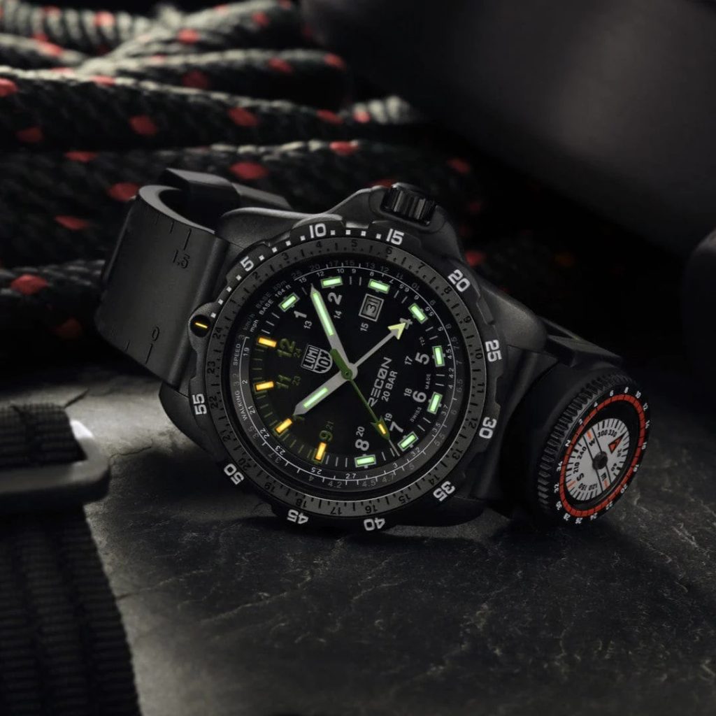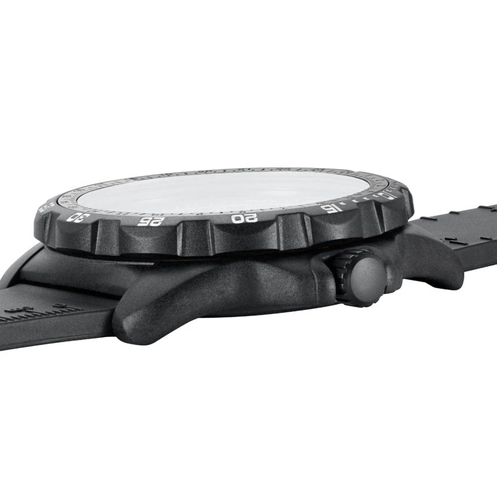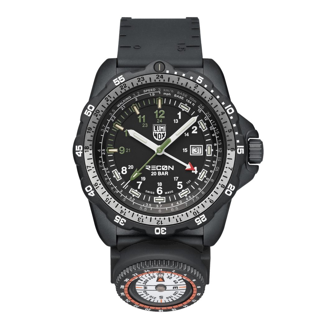 Ciferník chráni zafírové sklíčko s antireflexnou vrstvou a hodinky sú vodotesné do 200 metrov. Je poháňaný švajčiarskym quartzovým strojčekom GMT RONDA 515.24H umožňuje sledovať dve časové pásma súčasne, takže je ideálny na medzinárodné cestovanie. Čierny remienok z odolnej gumy obsahuje integrované mapové stupnice, pravítko a navyše odnímateľný kompas, čím sa z hodiniek stáva kompletné navigačné zariadenie. Vďaka technológii Luminox Light zostávajú hodinky viditeľné za všetkých svetelných podmienok a ich stála žiara vydrží až 25 rokov.