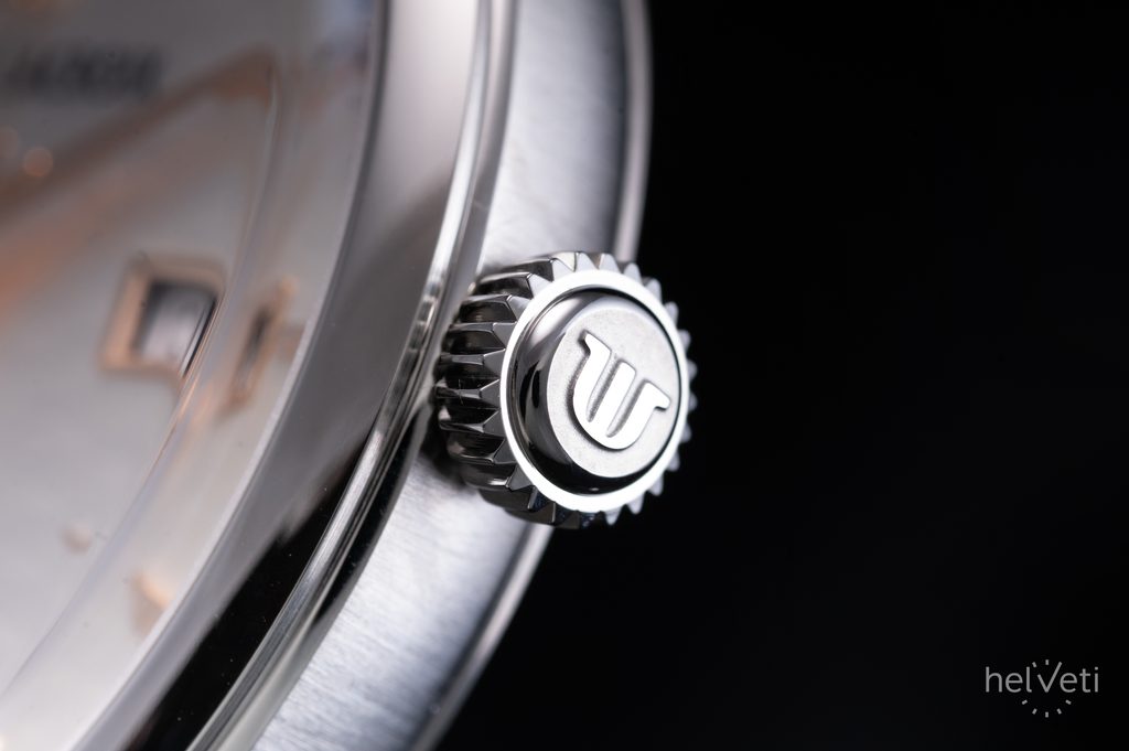 Strieborný ciferník zachytáva vzhľad zvlnených kopcov za úsvitu, keď je krajina zahalená do striebornej hmly, čo dodáva motívu Vague du Jura pocit pokoja. Klenuté zafírové sklíčko s obojstrannou antireflexnou vrstvou navyše zvýrazňuje bohato štruktúrovaný povrch ciferníka. Hoci skrutkovacie puzdro nemá výhľad na strojček, nájdeme na ňom zaujímavú rytinu prírody kantónu Jura. Vodotesnosť tohto modelu je 50 m, takže zvládne základný kontakt s vodou, napríklad umývanie rúk alebo sprchovanie.