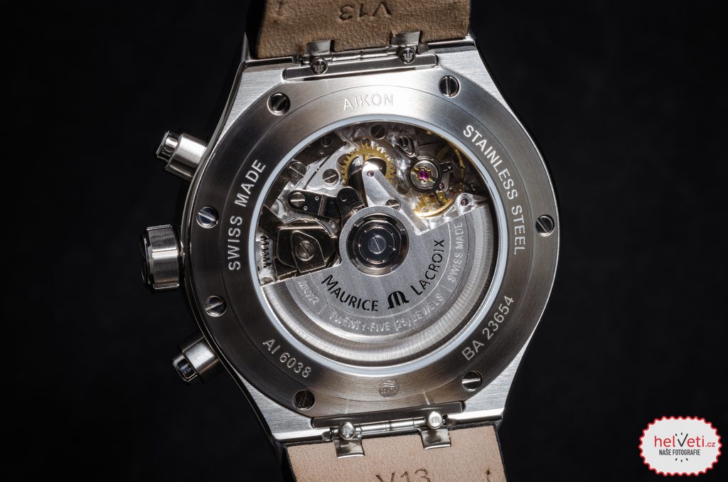 Hodinky Maurice Lacroix Aikon Automatic Chronograph AI6038-SS001-131-1 majú puzdro z ušľachtilej ocele, ktoré dopĺňa modrý kožený remienok. Vo vnútri spoľahlivo pracuje švajčiarsky mechanický strojček s automatickým naťahovaním ML112, ktorého činnosť možno pozorovať cez priehľadný zadný kryt. Je založený na spoľahlivom strojčeku Sellita SW500, pracuje s frekvenciou 28 800 polfrekvencií za hodinu a má 25 drahokamov. Rezerva náťahu je až 48 hodín. Rotor a mostíky sú zdobené zvislými ženevskými pruhmi (Côtes de Genève). Okrem dátumu a dňa v týždni nájdeme na hodinkách aj užitočnú funkciu stopiek. Pohyb má aj funkciu "hacking" (zastavenie sekundovej ručičky na príkaz) a možnosť ručného naťahovania korunkou.