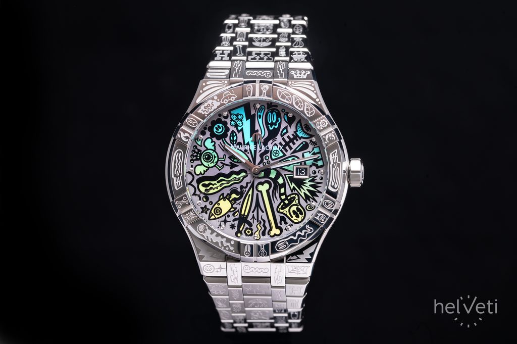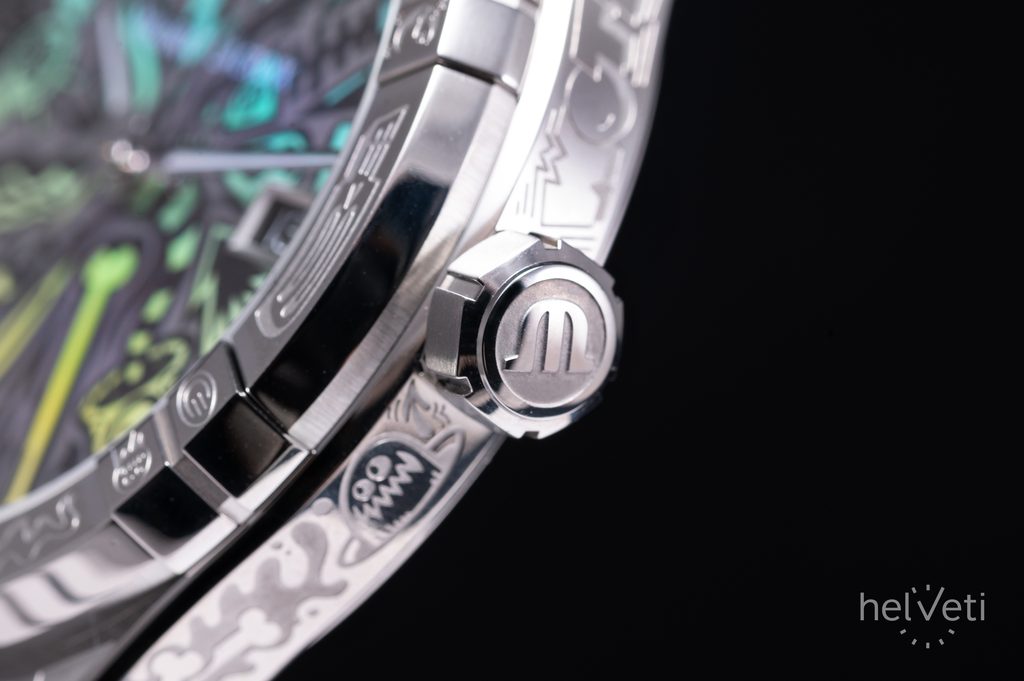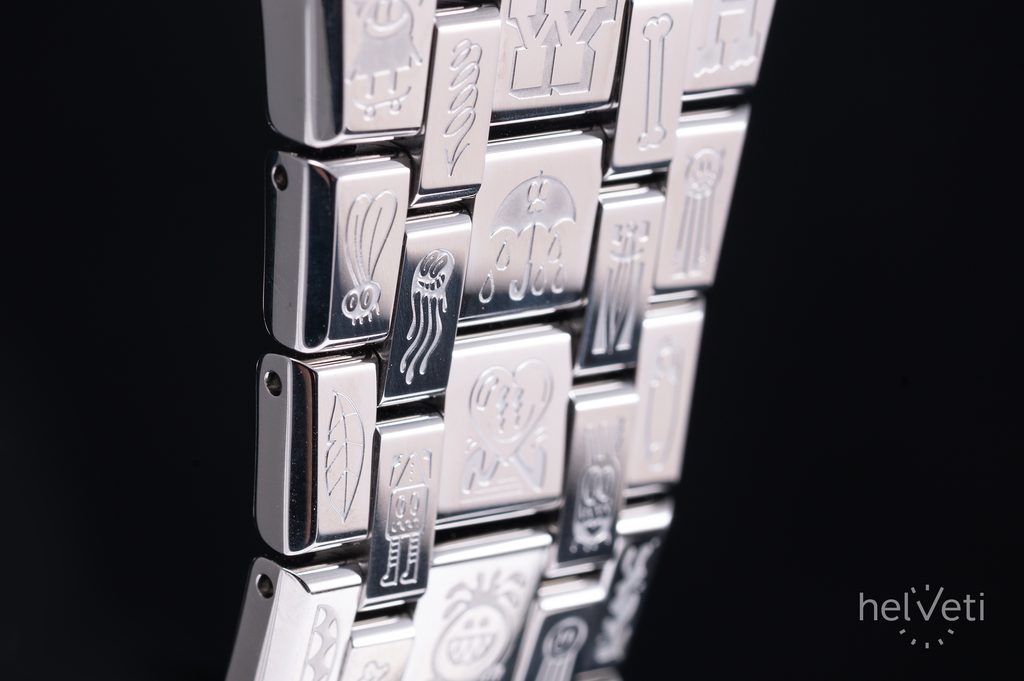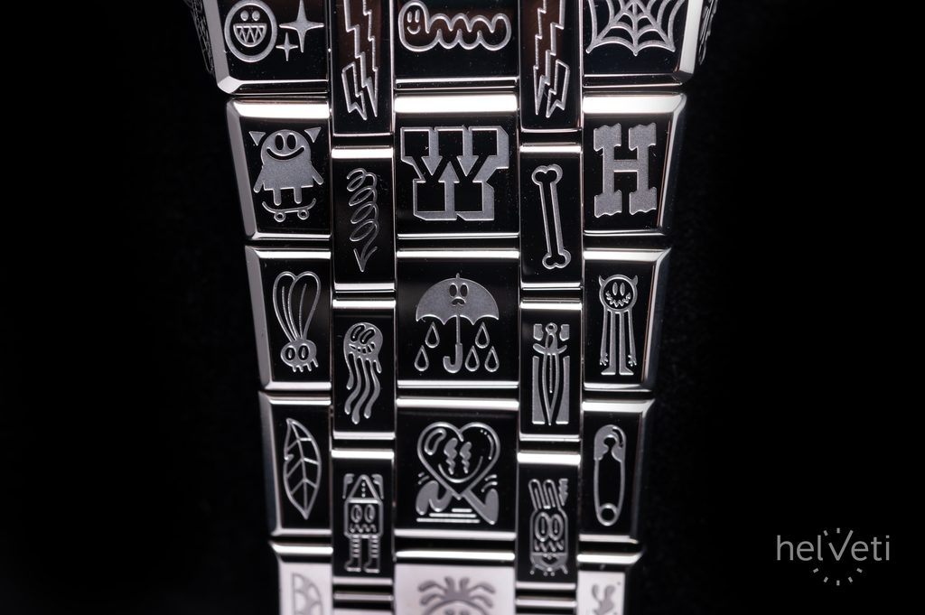 Čmáranice (kresby alebo čmáranice) nájdete po celom ciferníku v tyrkysovej a zelenožltej farbe, ako aj na lunete okolo sklíčka, po stranách puzdra a na vonkajšej časti náramku.