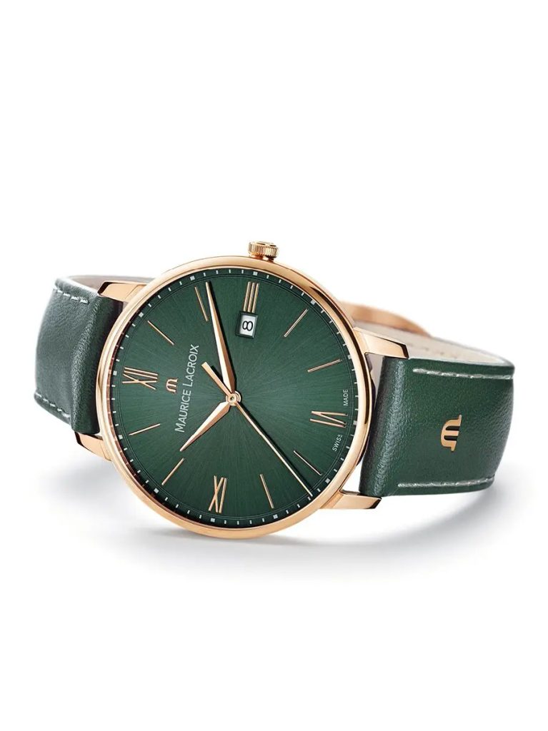 Hodinky Maurice Lacroix Eliros Date EL1118-PVP01-610-1 majú puzdro z ušľachtilej ocele s povrchovou úpravou ružového zlata PVD, ktoré dopĺňa zelený remienok z teľacej kože. Vo vnútri spoľahlivo tiká batériový strojček švajčiarskej výroby Ronda 515. Hodinky sú vybavené dátumovkou, ktorú nájdete na 3. hodine.