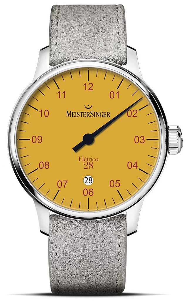 Hodinky MeisterSinger Edition Elétrico 28 ED-Eletrico majú 40 mm oceľové puzdro. Ukrýva ciferník v charakteristickom žltom odtieni, ktorý je charakteristickým znakom električky. Žltú farbu dopĺňajú jemné červené detaily - odkaz na dizajn interiéru veterána. Hodinky majú tiež vkusne zakomponované okienko s dátumovkou na pozícii 6 hodín. Všetko chráni kvalitné zafírové sklíčko.
