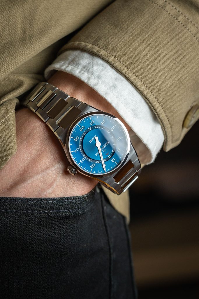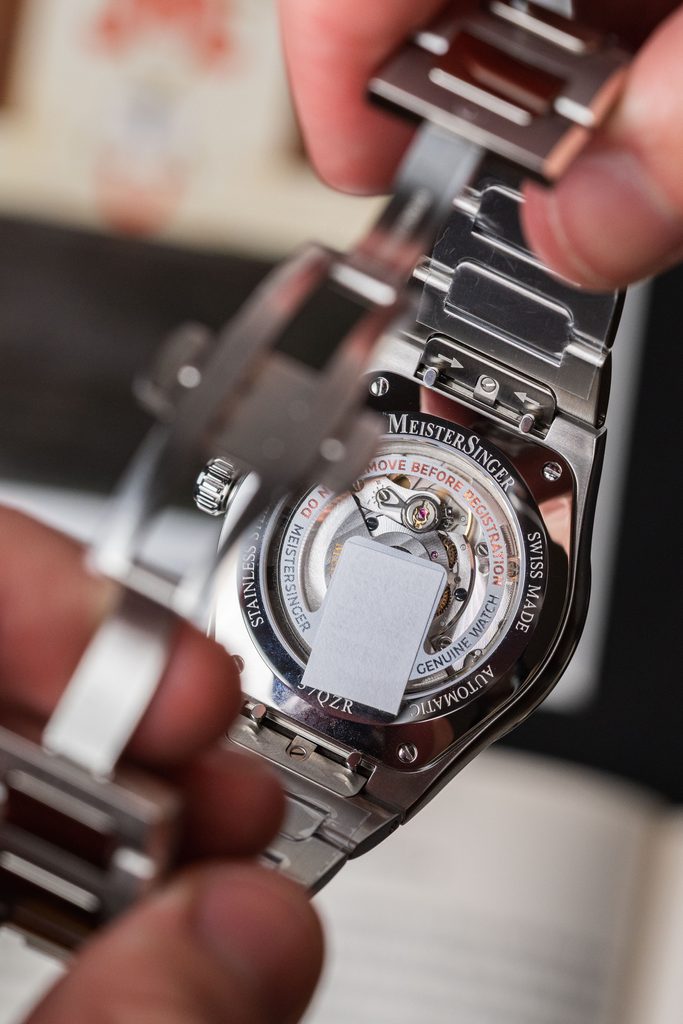Integrovaný oceľový náramok so šírkou 20 mm, ktorý plynulo prechádza do puzdra, má tiež leštené aj brúsené povrchy, čím ponúka nielen stabilitu, ale aj maximálne pohodlie pri nosení. Dokonca aj protišmyková, ľahko ovládateľná korunka nesie jedinečné dizajnové prvky, najmä symbol z loga MeisterSinger, ktorý v hudobnej notácii označuje znak"odpočinku".