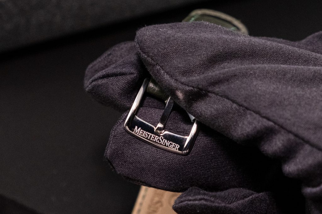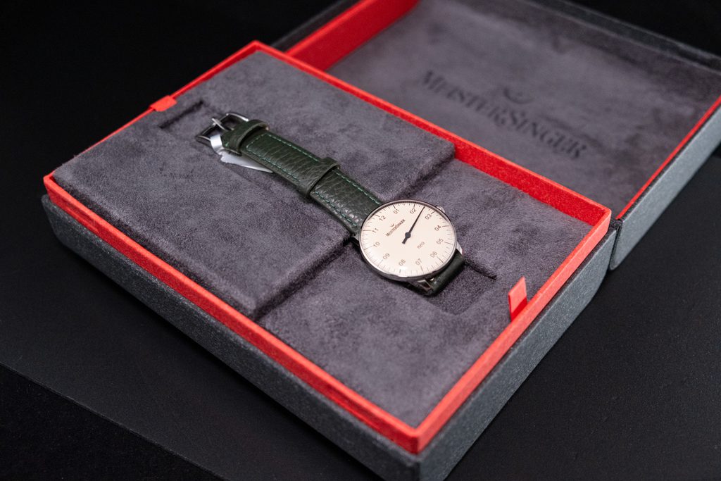 Celý vzhľad hodiniek je inšpirovaný modelmi z 50. a 60. rokov minulého storočia. Puzdro hodiniek MeisterSinger Neo NES903 je vyrobené z ušľachtilej ocele a dopĺňa ho zelený kožený remienok s jemnou štruktúrou. Voliteľne možno hodinky MS Neo NES903 zakúpiť aj v kombinácii s hnedým semišovým koženým remienkom alebo sieťovinou - jemným pleteným kovovým náramkom.