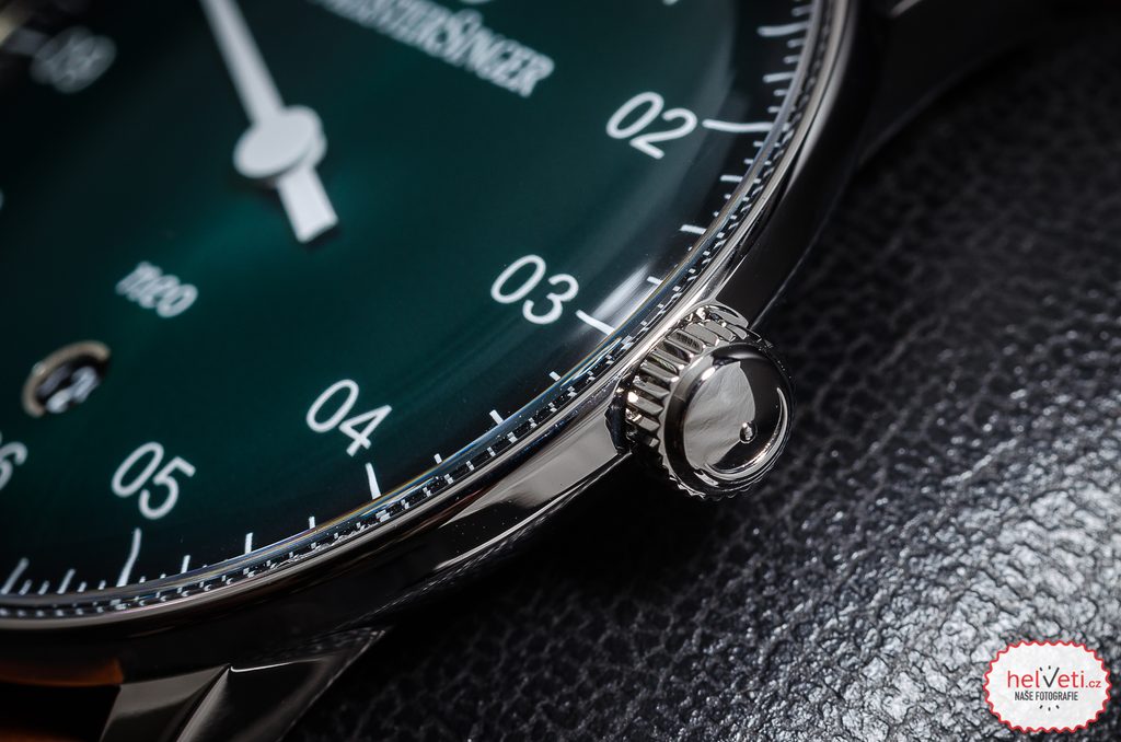 Puzdro hodiniek MeisterSinger Neo Plus NE419D je vyrobené z ušľachtilej ocele a v jeho vnútri tiká švajčiarsky mechanický strojček Sellita SW 200-1 s automatickým náťahom. Na pozícii 6 potom nájdeme nenápadný, ale praktický ukazovateľ dátumu. Číselník má, rovnako ako celý model, ľahký retro nádych, u tohto modelu konkrétne nájdeme inšpiráciu z 50. rokov a samozrejmosťou je jeho výborné spracovanie. Vďaka typickej minútovej stupnici sa môžete spoľahnúť na dokonalú prehľadnosť aj napriek tomu, že je čas zobrazený iba jednou ručičkou. Číselník má zelenú farbu, ktorá ku krajom prechádza do čiernej. Odtieň zelenej sa mení podľa dopadajúceho svetla.
