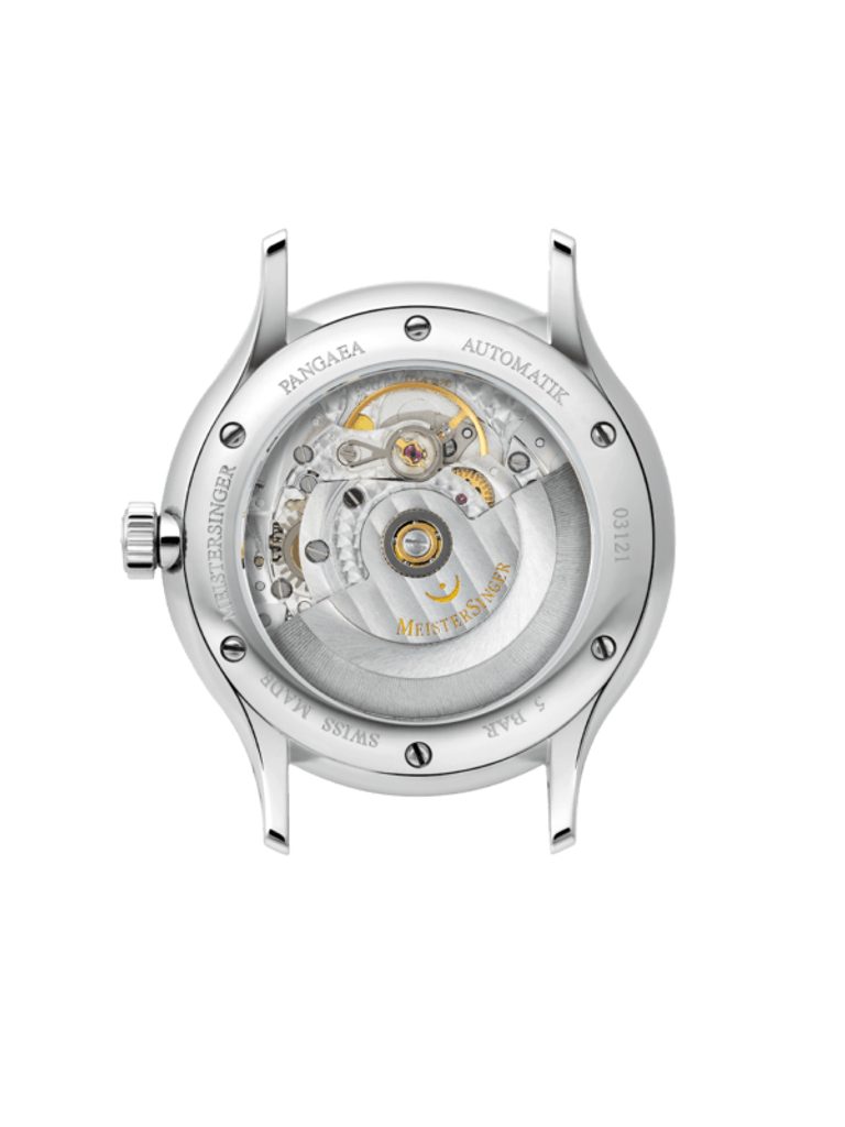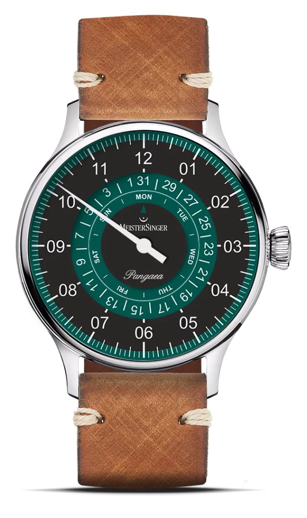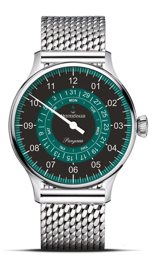 Puzdro hodiniek MeisterSinger Pangaea Day Date PDD902P je vyrobené z nehrdzavejúcej ocele a vnútri tiká švajčiarsky mechanický strojček Sellita SW 220-1 s automatickým naťahovaním. Tento ozdobný strojček pracujúci s frekvenciou 28 800 polfrekvencií za hodinu je možné pozorovať vďaka priehľadnému ciferníku. Dátum a deň v týždni sa dajú odčítať na pozícii 12, ktorú zobrazuje dvojica odkrytých kotúčov v strede ciferníka. Ciferník, rovnako ako celý model, má ľahký retro nádych a, samozrejme, spracovanie je vynikajúce. Farebná kombinácia ciferníka je čierno-zelená. Vďaka typickej minútovej stupnici sa môžete spoľahnúť na dokonalú prehľadnosť, aj keď sa čas zobrazuje len jednou ručičkou.