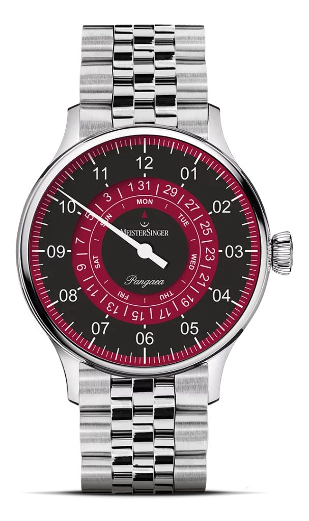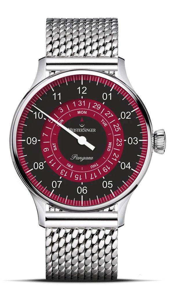 Puzdro hodiniek MeisterSinger Pangaea Day Date PDD902R je vyrobené z nehrdzavejúcej ocele a vnútri tiká švajčiarsky mechanický strojček Sellita SW 220-1 s automatickým naťahovaním. Tento ozdobný strojček pracujúci s frekvenciou 28 800 polfrekvencií za hodinu je možné pozorovať vďaka priehľadnému ciferníku. Dátum a deň v týždni sa dajú odčítať na pozícii 12, ktorú zobrazuje dvojica odkrytých kotúčov v strede ciferníka. Ciferník, rovnako ako celý model, má ľahký retro nádych a, samozrejme, spracovanie je vynikajúce. Farebná kombinácia ciferníka je čierna a červená. Vďaka typickej minútovej stupnici sa môžete spoľahnúť na dokonalú prehľadnosť, aj keď sa čas zobrazuje len jednou ručičkou.