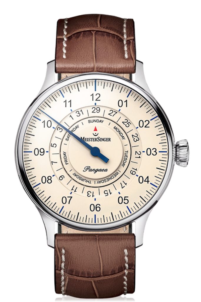 Hodiny MeisterSinger Pangaea Day Date PDD903 patria do série Classic Plus a ponúkajú netradičné, ale o to zaujímavejšie zobrazenie času pomocou jednej ručičky. Hlavnou črtou tohto modelu je zobrazenie dňa a dátumu, zobrazené pomocou kotúčikov v strede ciferníka. Fanúšikovia kvalitného hodinárstva a netradičných riešení si preto určite prídu na svoje.