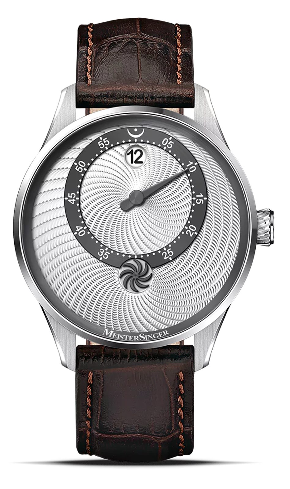 Hlavným znakom hodiniek je však jednoduchý, ale veľmi pôsobivý ručne vyrobený strieborný ciferník, ktorý stelesňuje štýl a eleganciu. Je zasadený do mimoriadne úzkeho rámčeka. Na ciferníku, ktorý zobrazuje čas minimalistickým, pokojným a úplne intuitívnym spôsobom, je mimo stredu umiestnená ručička, ktorá meria uplynuté minúty. Hodiny sa zobrazujú v dokonale okrúhlom okienku na 12. hodine, kde sa číslice menia s absolútnou presnosťou hodinu po hodine. Potom pod logom nájdeme jemne rotujúce slnečné koliesko MeisterSinger - jemný ukazovateľ chodu, ktorý nahrádza sekundovú ručičku a potvrdzuje, že strojček je v prevádzke bez toho, aby narušil čistotu a harmóniu ciferníka. Táto novo koncipovaná geometria dodáva ciferníku pozoruhodný pocit hĺbky, dynamického napätia a vlastného jedinečného zmyslu pre poriadok.